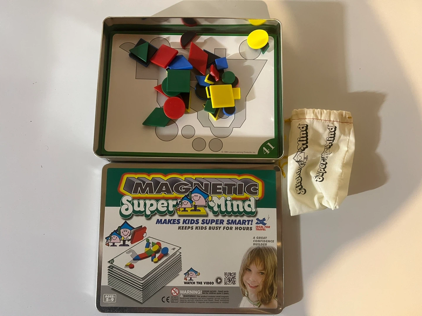 This Magnetic Super Mind set comes with various geometric shapes and a tin for storage. It's designed for ages 5-9 and helps keep kids busy. The tin includes a magnetic board and a pouch for the shapes.