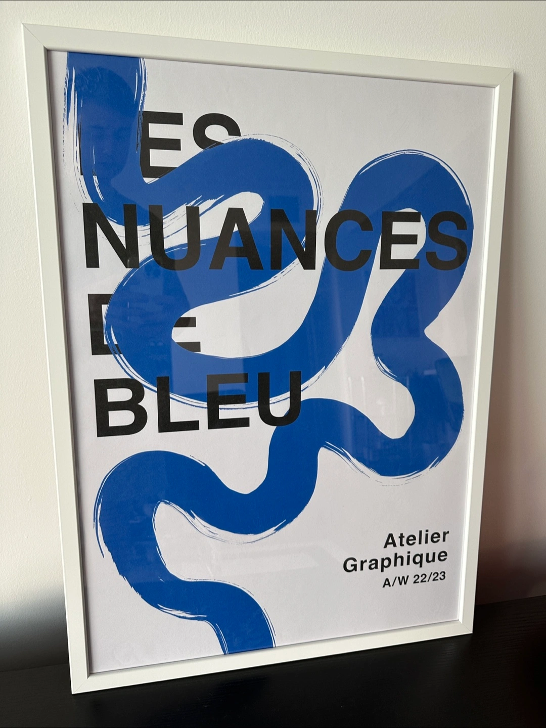 I am selling this framed print with the words "Les Nuances de Bleu". The print has a white frame and is in new condition. Placing this in your space could be just the thing to calm the mind after a long day. Written with AI.