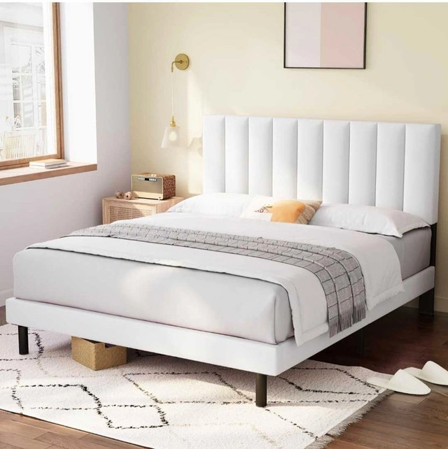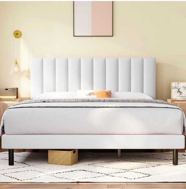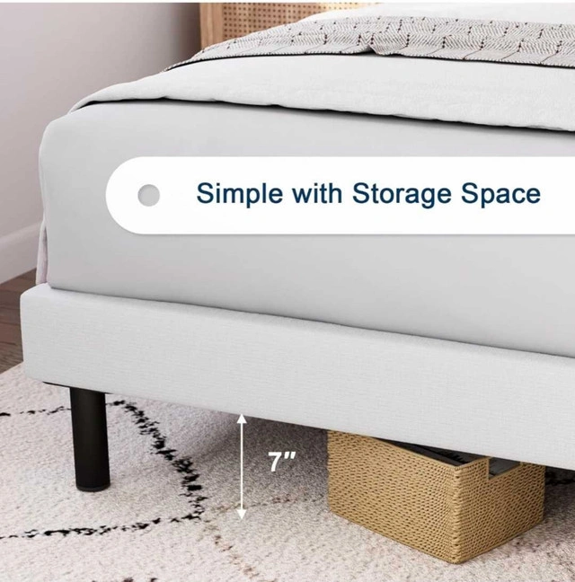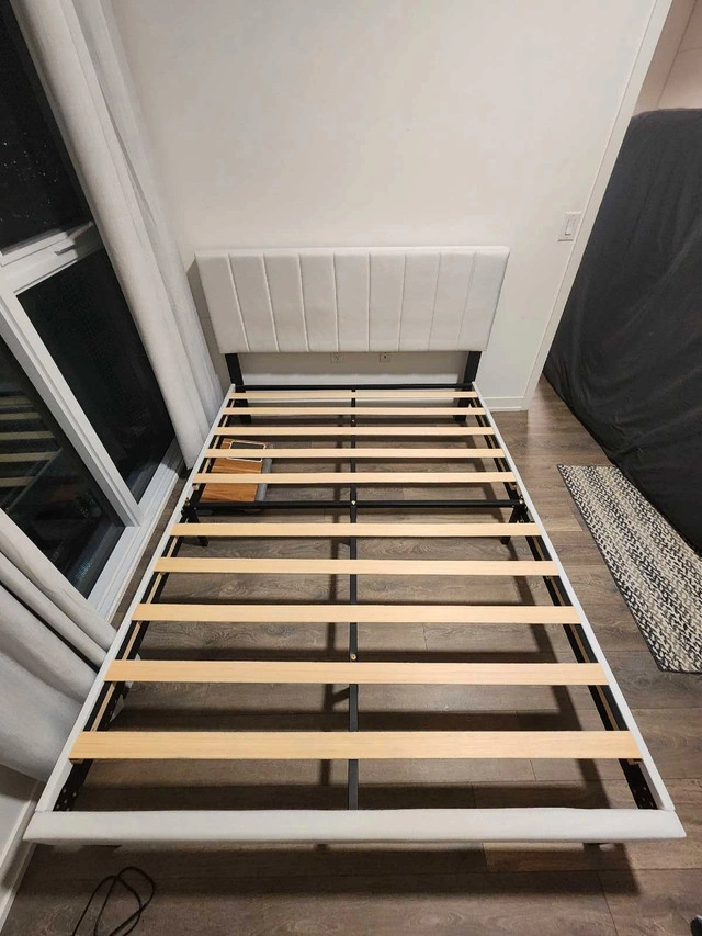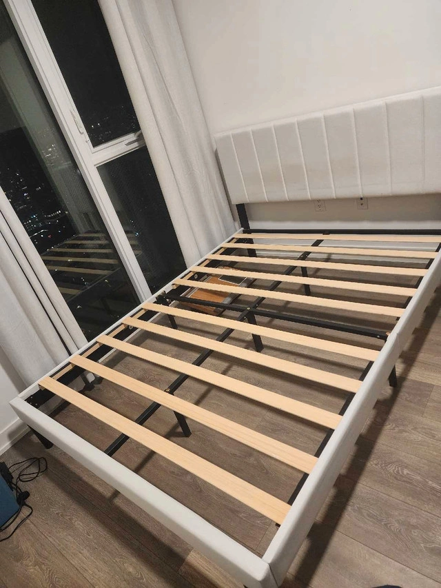 Smoke-free, pet-free home. Like new, bought less than 3 months ago. Selling because I'm moving. Great for a queen mattress and amazing quality. Originally bought for $500. Bed frame queen size: 60*82*42 inch. Minimalist design with upholstered headboard made of high-quality linen fabric. Headboard has a vertical strip pattern and comfortable foam cushion. Stable support with a durable steel frame structure and quality wood slats. Can hold up to 900 lbs. Easy to install (about 30 minutes). Under-bed storage.