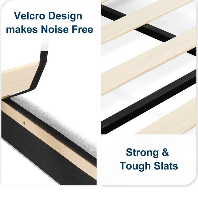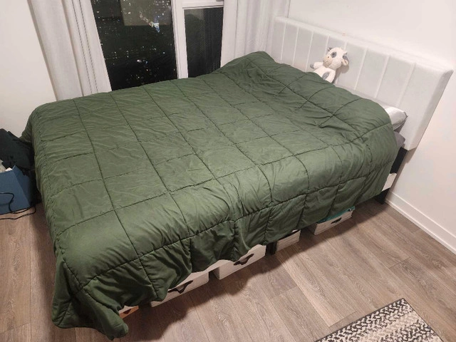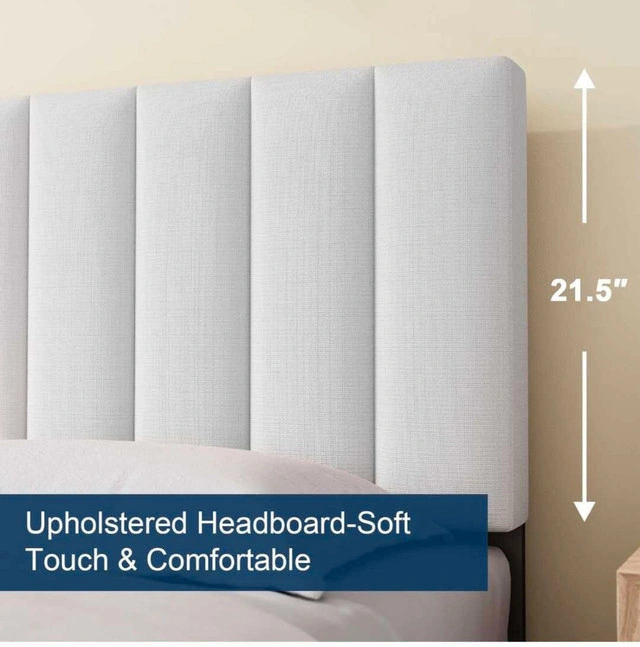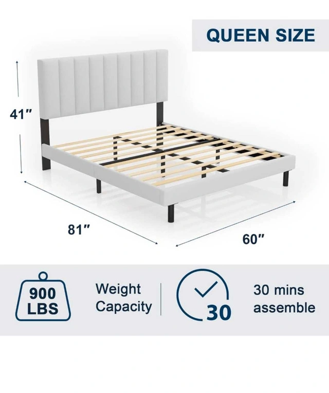 Smoke-free, pet-free home. Like new, bought less than 3 months ago. Selling because I'm moving. Great for a queen mattress and amazing quality. Originally bought for $500. Bed frame queen size: 60*82*42 inch. Minimalist design with upholstered headboard made of high-quality linen fabric. Headboard has a vertical strip pattern and comfortable foam cushion. Stable support with a durable steel frame structure and quality wood slats. Can hold up to 900 lbs. Easy to install (about 30 minutes). Under-bed storage.