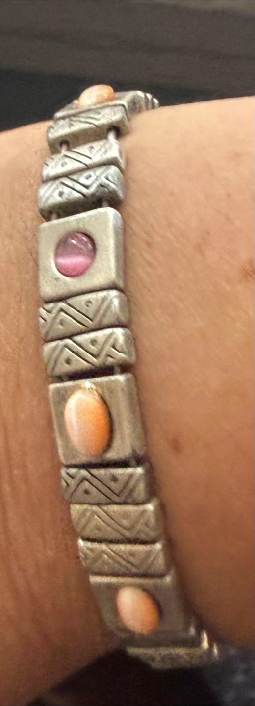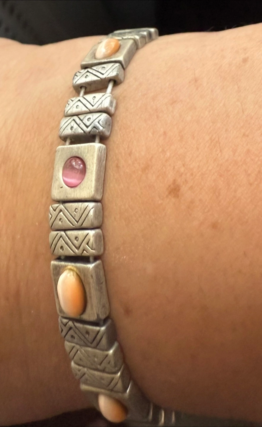Selling a Tazza bracelet. It features a unique design with alternating square links, some adorned with geometric patterns and others with pink and peach-colored cabochons. It's a stylish and eye-catching piece!