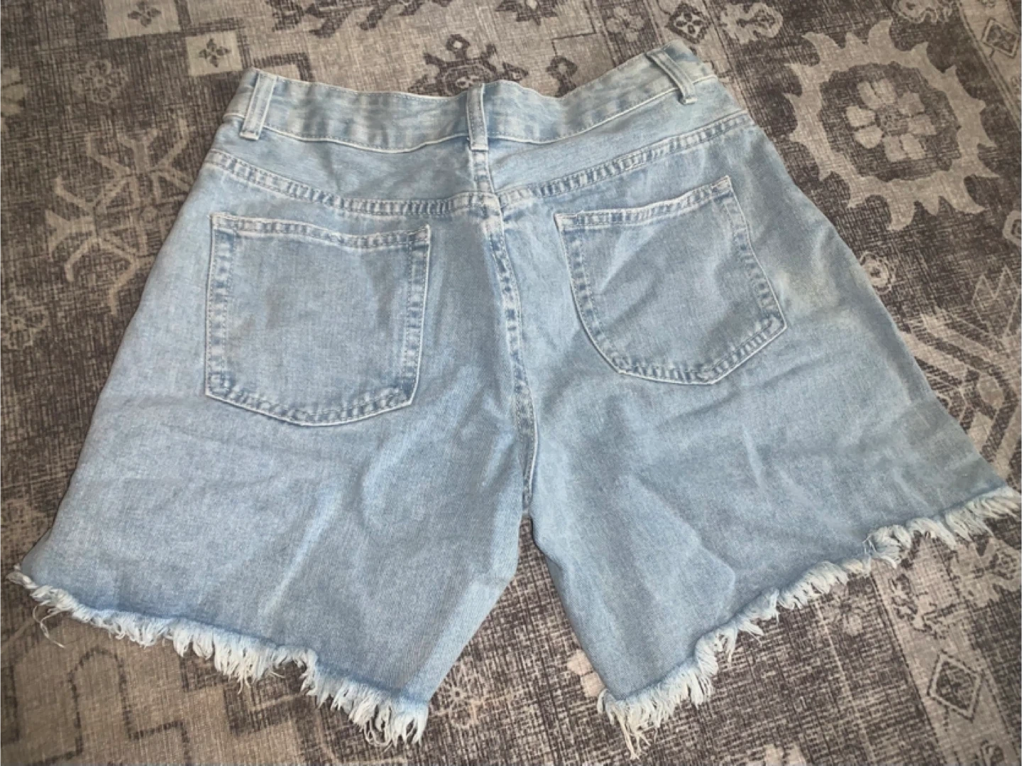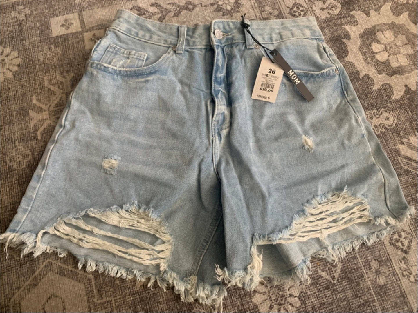 Light wash denim Mom jean shorts from Forever 21. These shorts feature a distressed look with ripped details and a frayed hem. Size 26. Perfect for warmer weather!