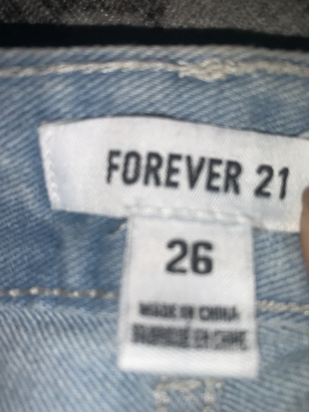 Light wash denim Mom jean shorts from Forever 21. These shorts feature a distressed look with ripped details and a frayed hem. Size 26. Perfect for warmer weather!
