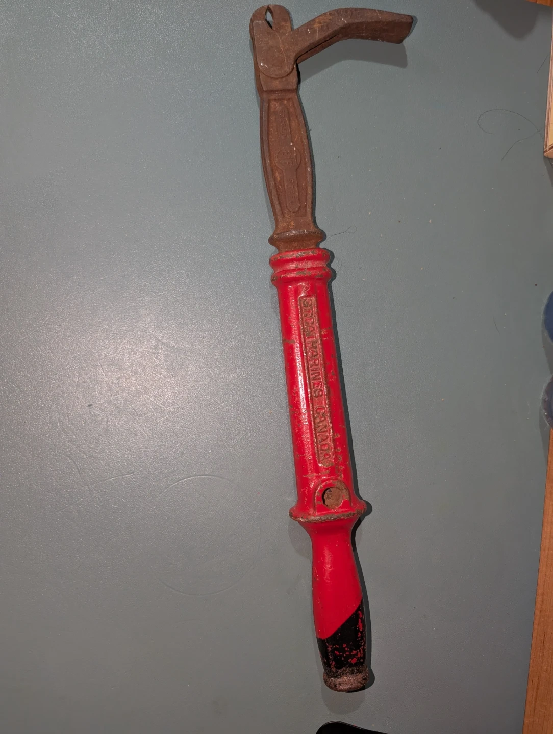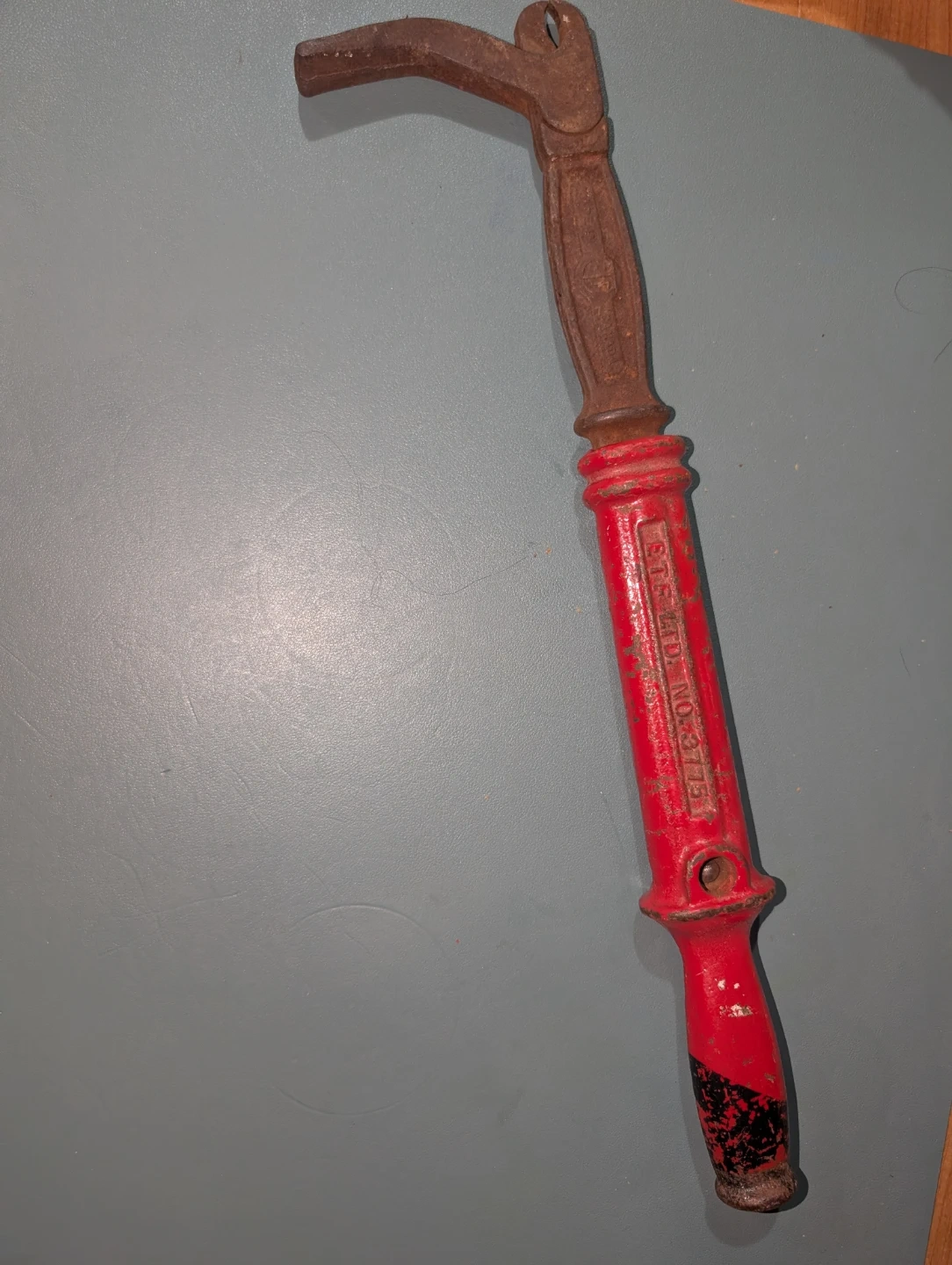 This is a vintage Grip Tite pipe wrench, model 375. It's made of durable metal with a red and black handle. This wrench is a handy tool for plumbing tasks.