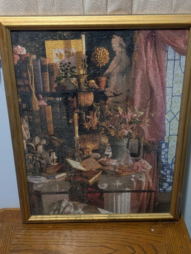 This framed jigsaw puzzle is a captivating piece featuring a still life scene with books, flowers, and a statue, all encased in an elegant gold frame. The puzzle is used, but complete and in good condition, ready to add a touch of classic charm to any room. It’s like owning a little piece of art that you can admire without having to put it together yourself!