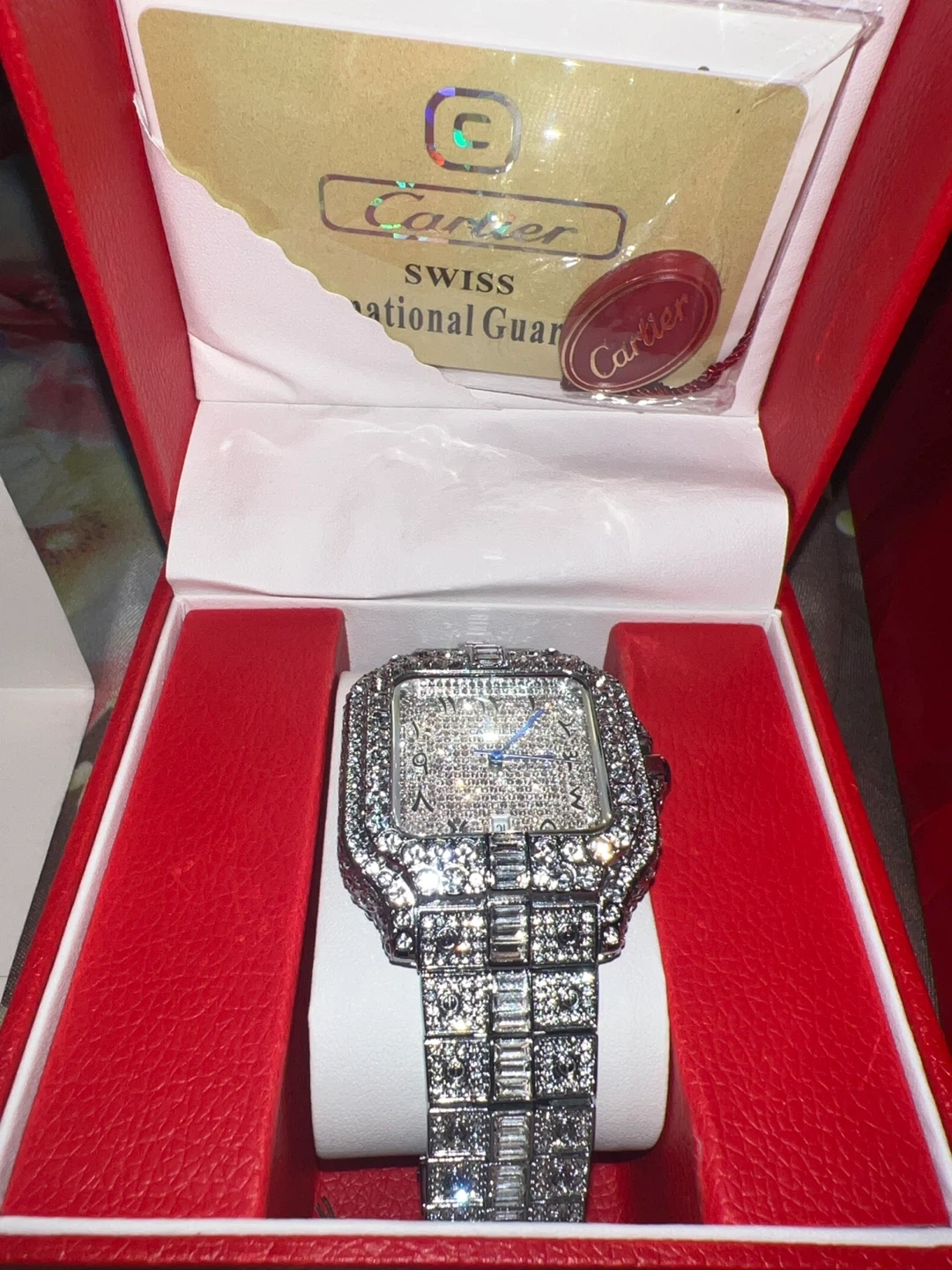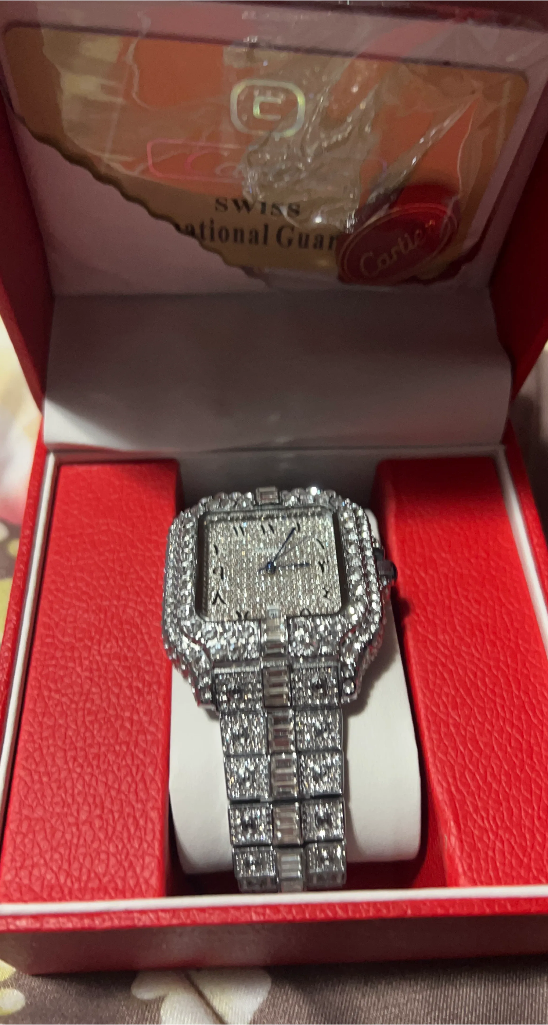 A beautiful Cartier watch in its original box. This timepiece is fully loaded with beautiful stones and features a classic Arabic Roman numeral dial.