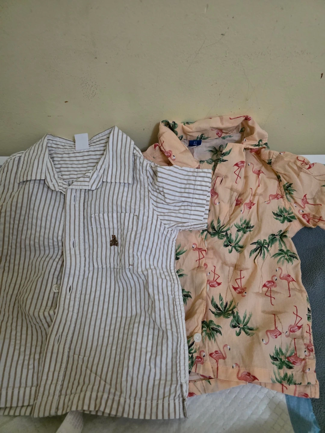 Two kids' short-sleeve button-up shirts. One features classic brown and white stripes, brand GAP. The other has a fun coral-peach background with a flamingo and palm leaf pattern, brand OLD NAVY. They're perfect for warm weather outings!