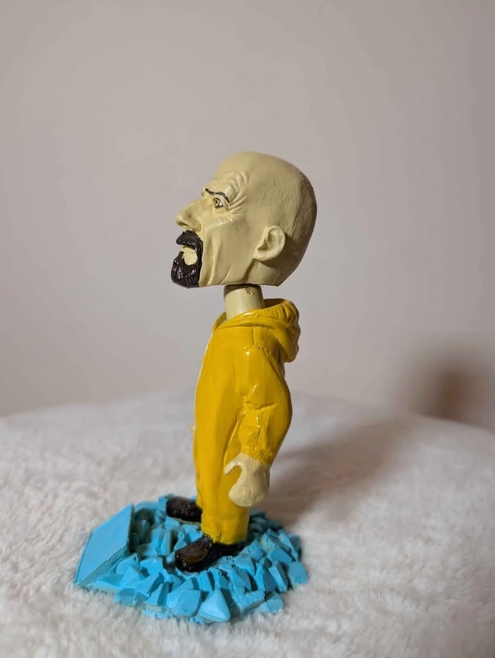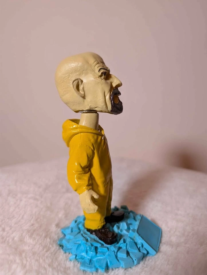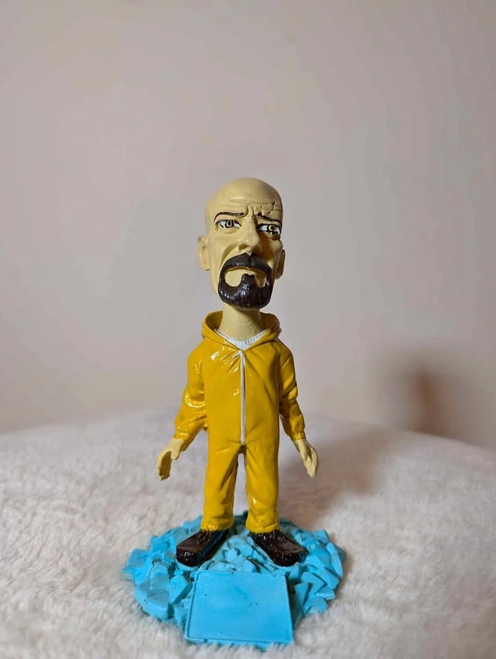 Unique hand-painted collectible figure of Walter White from Breaking Bad, styled in his iconic yellow hazmat suit and standing on a blue crystal base inspired by the show. Perfect for fans, collectors, or display on a desk or shelf.