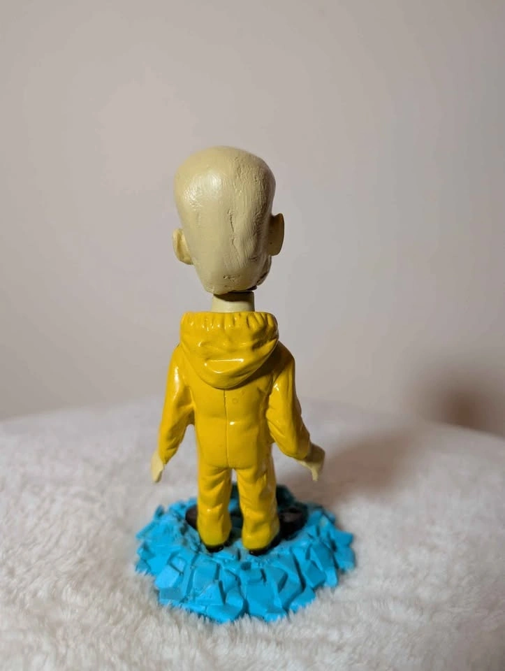 Unique hand-painted collectible figure of Walter White from Breaking Bad, styled in his iconic yellow hazmat suit and standing on a blue crystal base inspired by the show. Perfect for fans, collectors, or display on a desk or shelf.