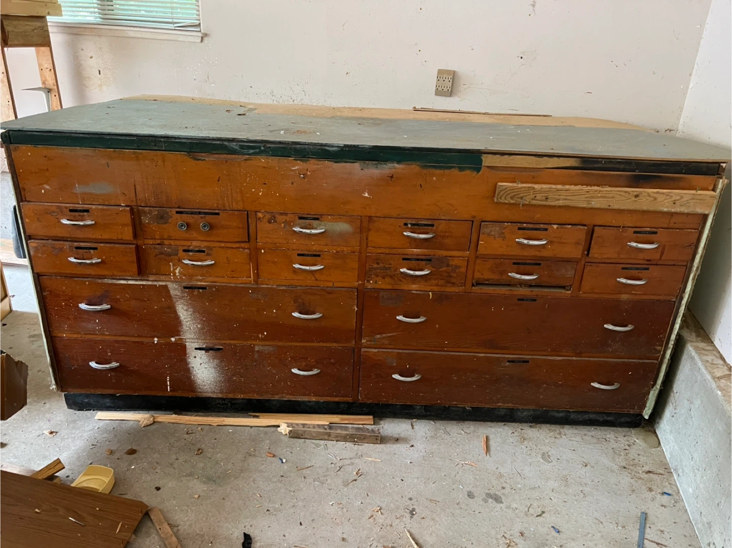 This is a large wooden workbench with numerous drawers for storage. It is very sturdy, possibly for a workshop or garage. Great for organizing tools or supplies!