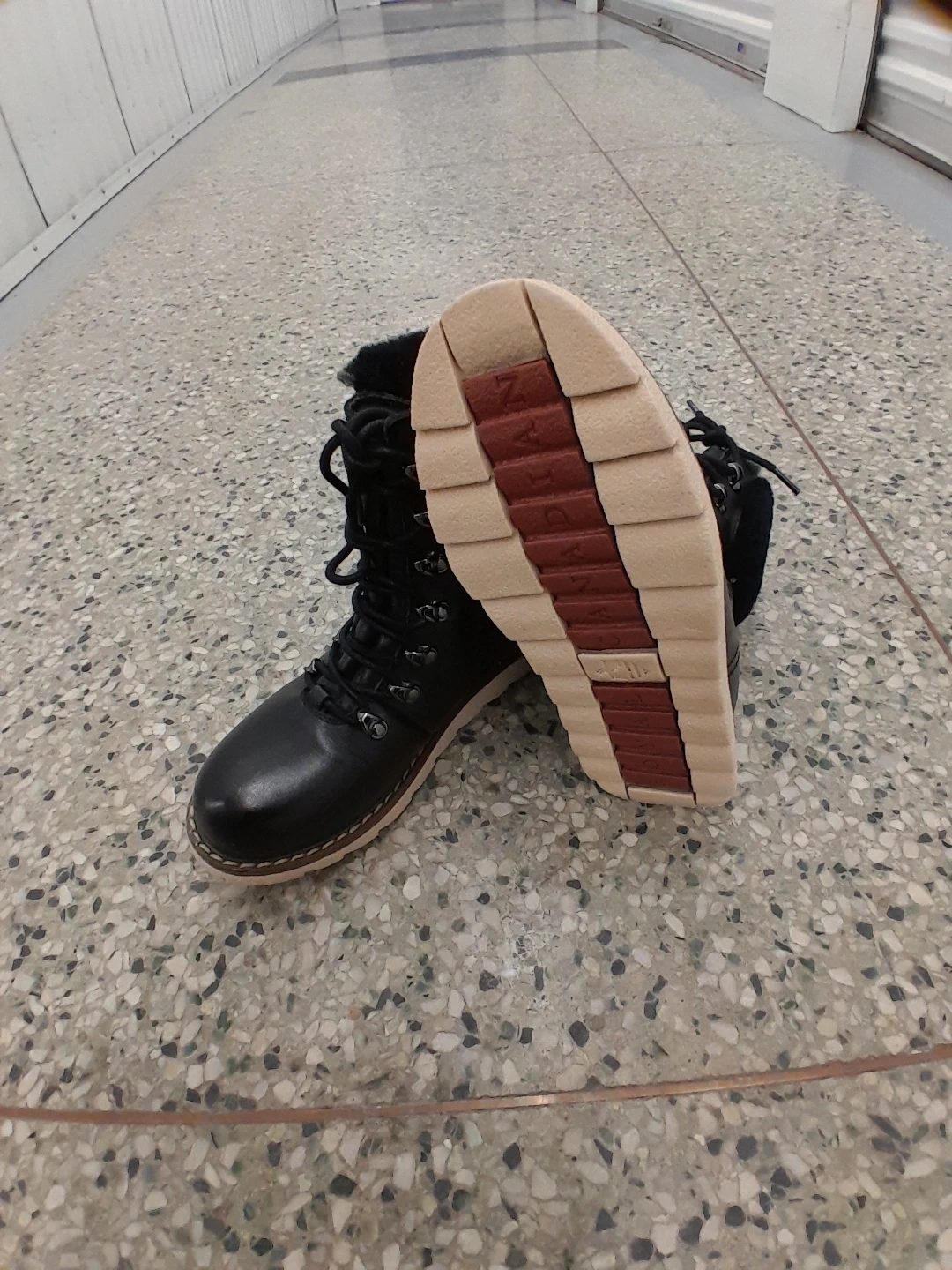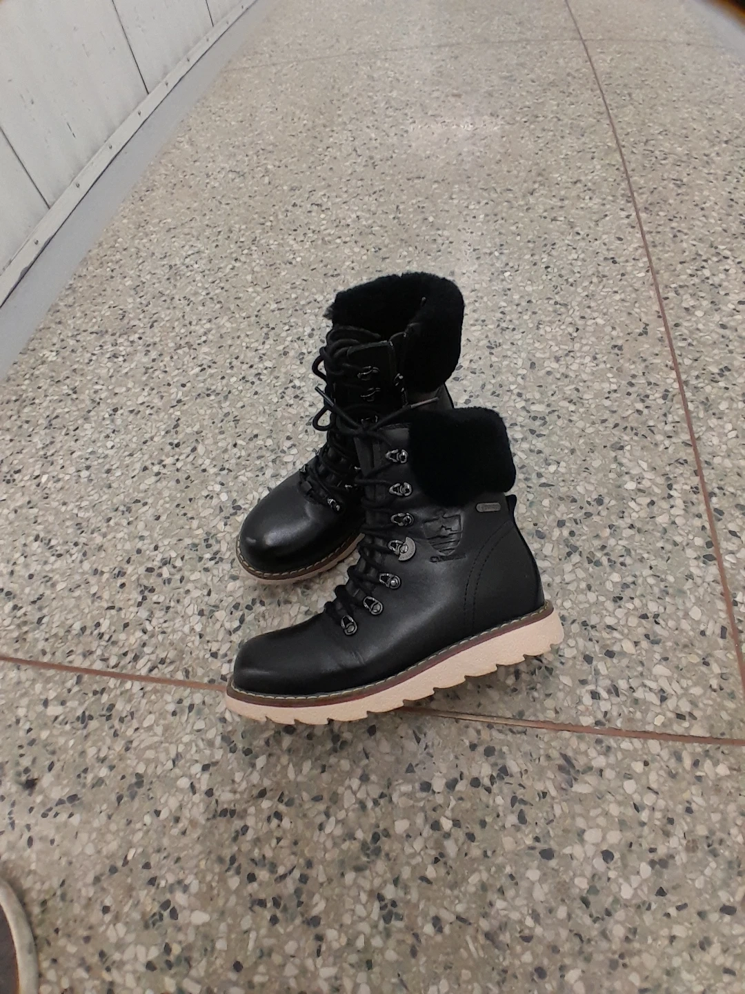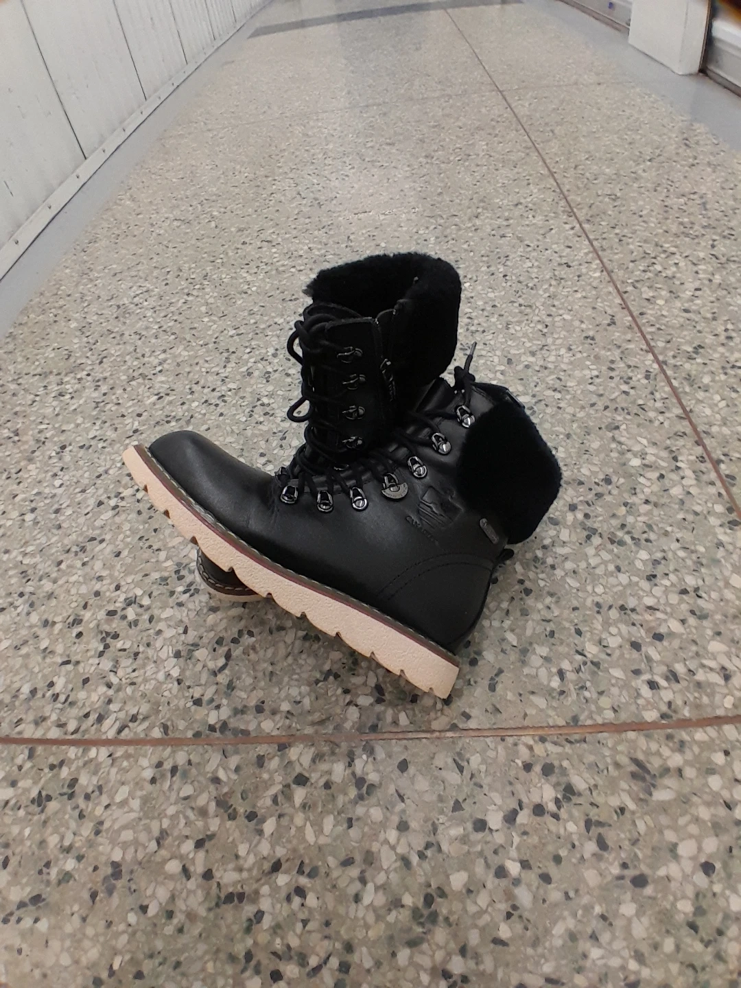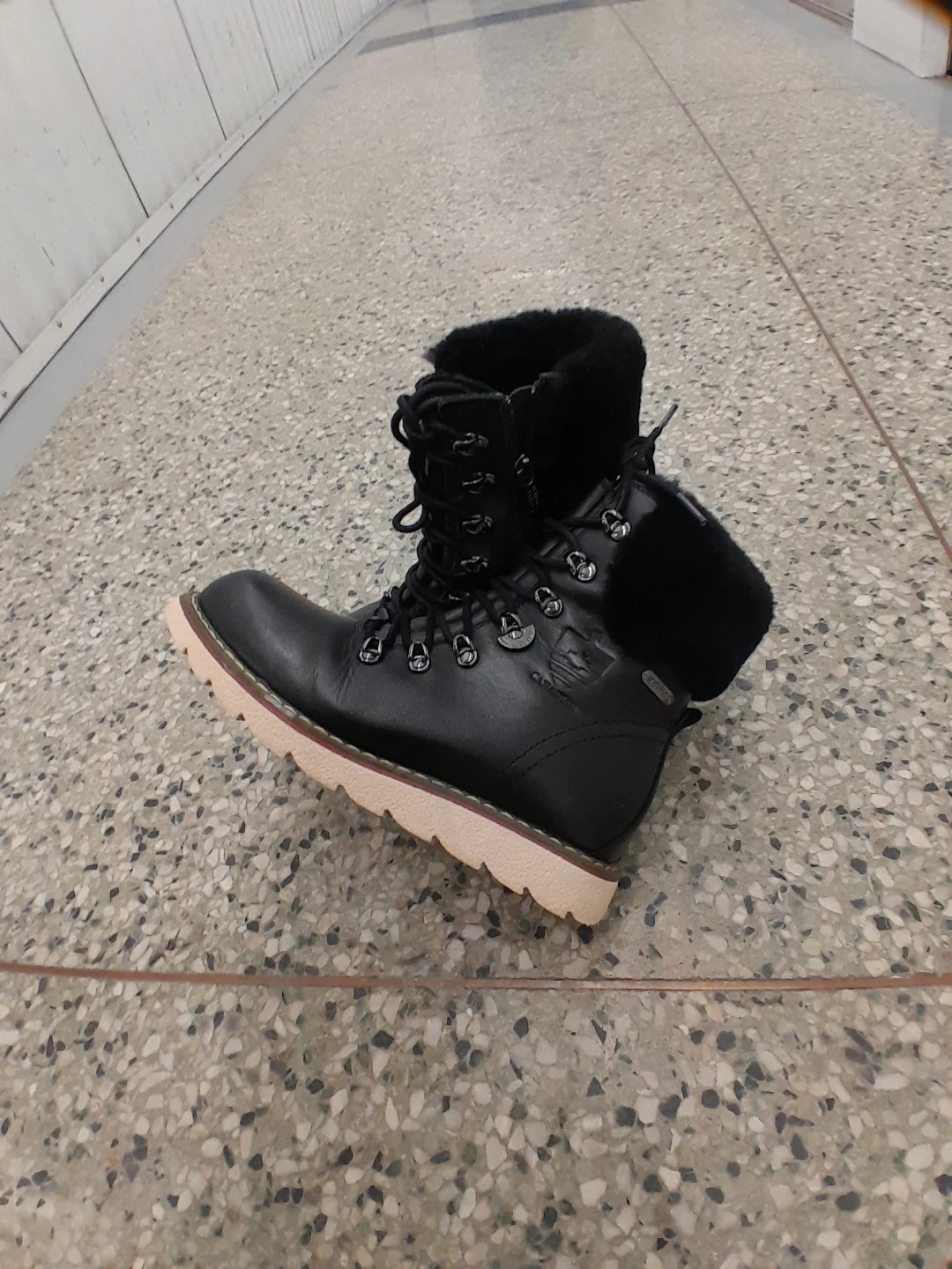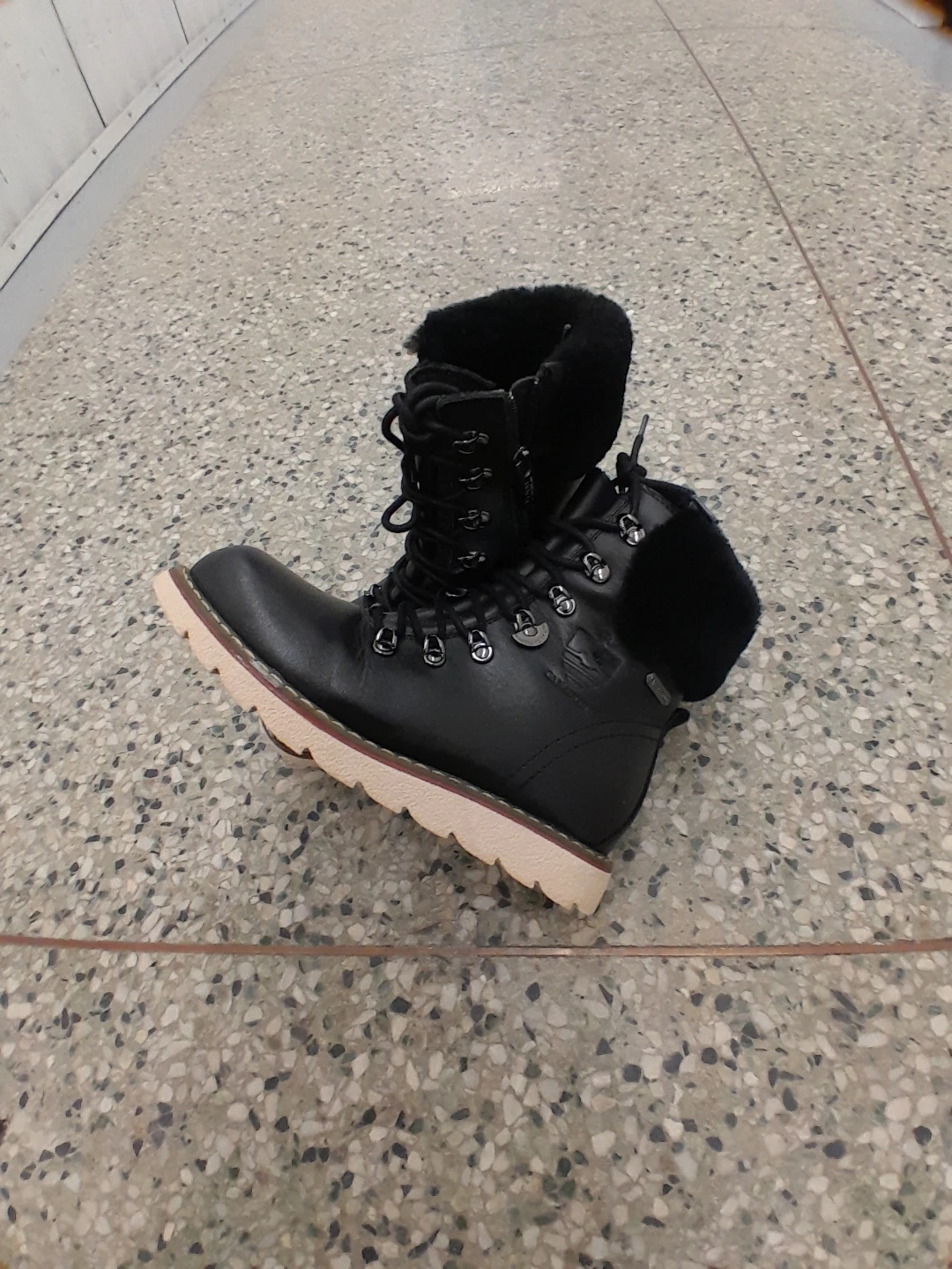 feature a cozy fur lining for extra warmth. They have a durable rubber sole with good traction. Lace-up front for a secure fit women's Size 7