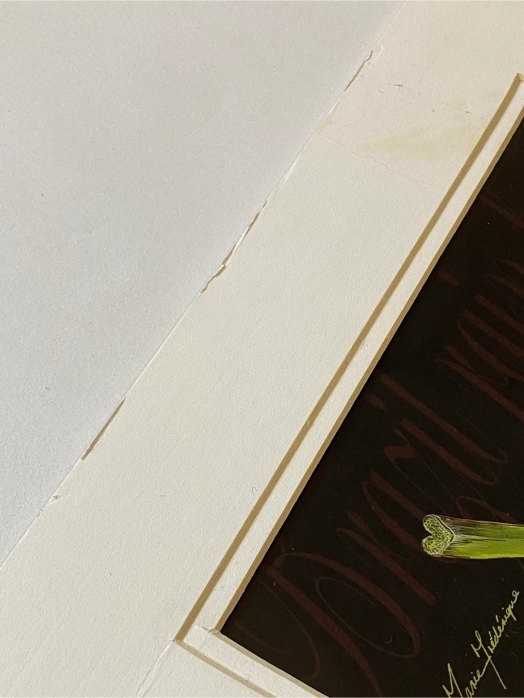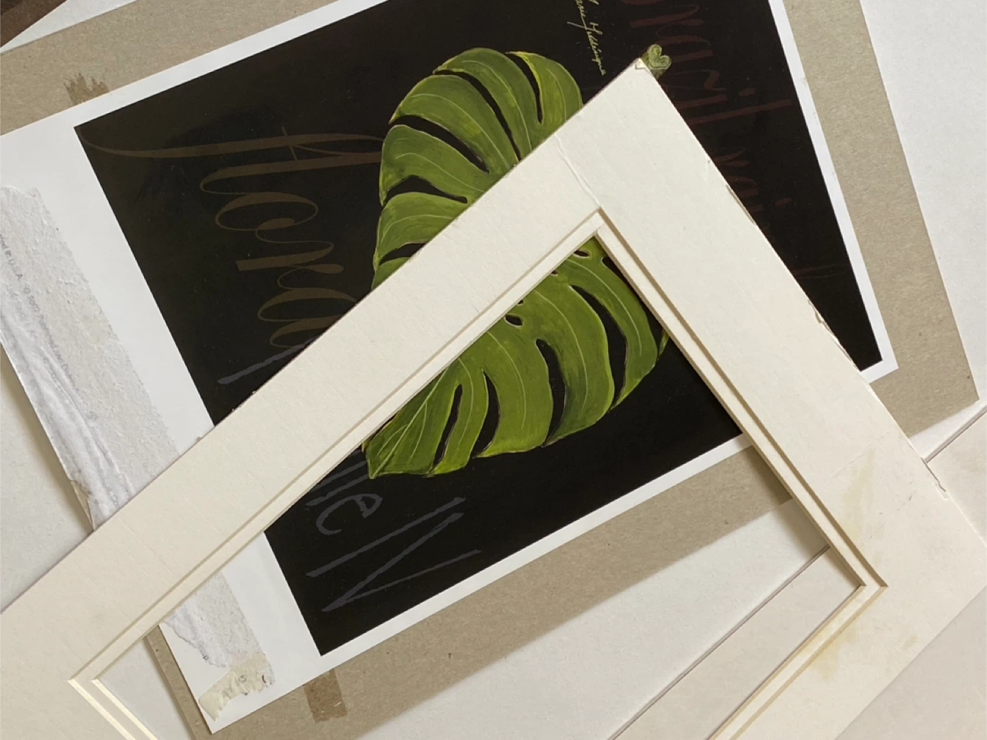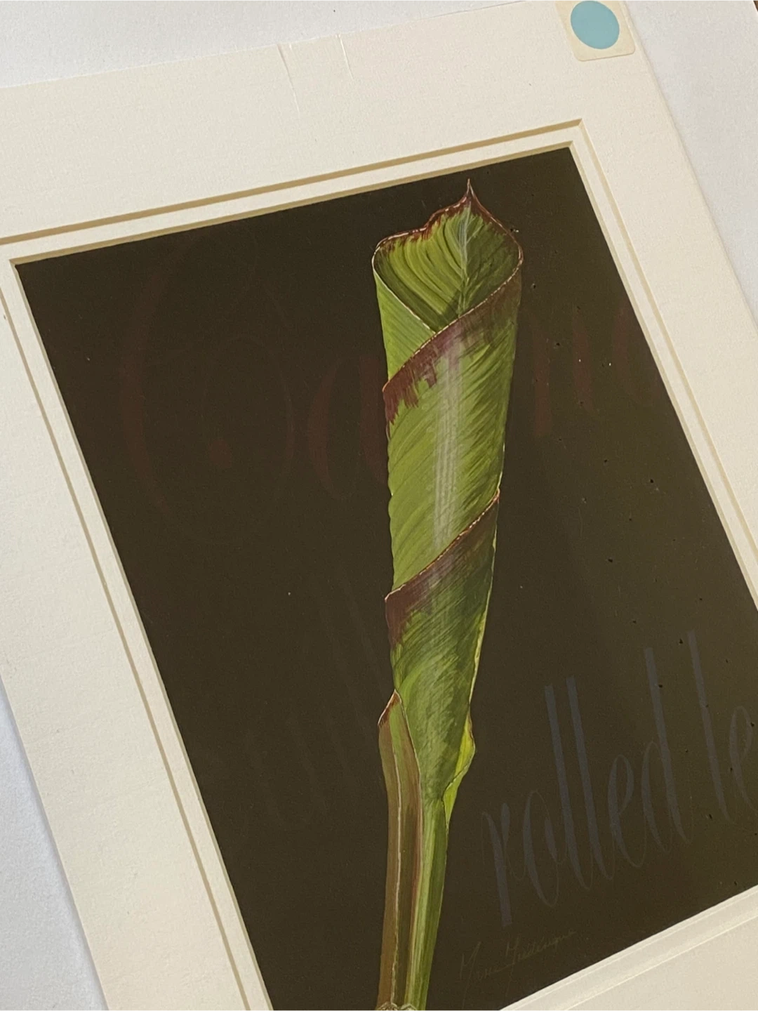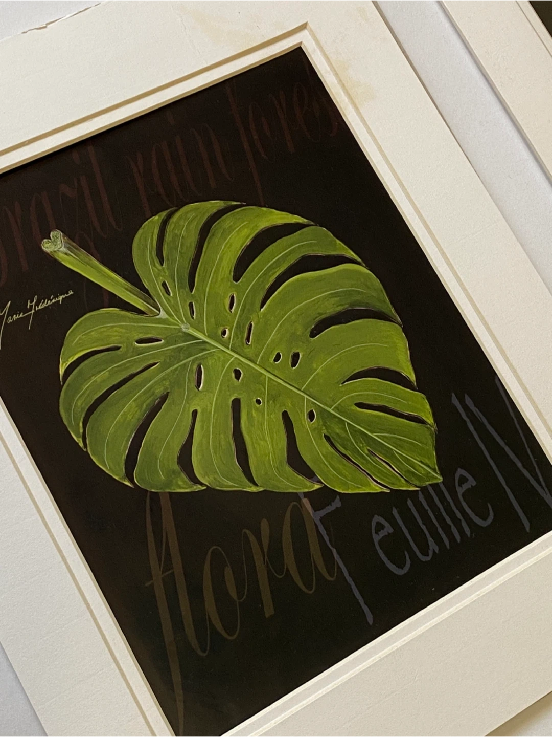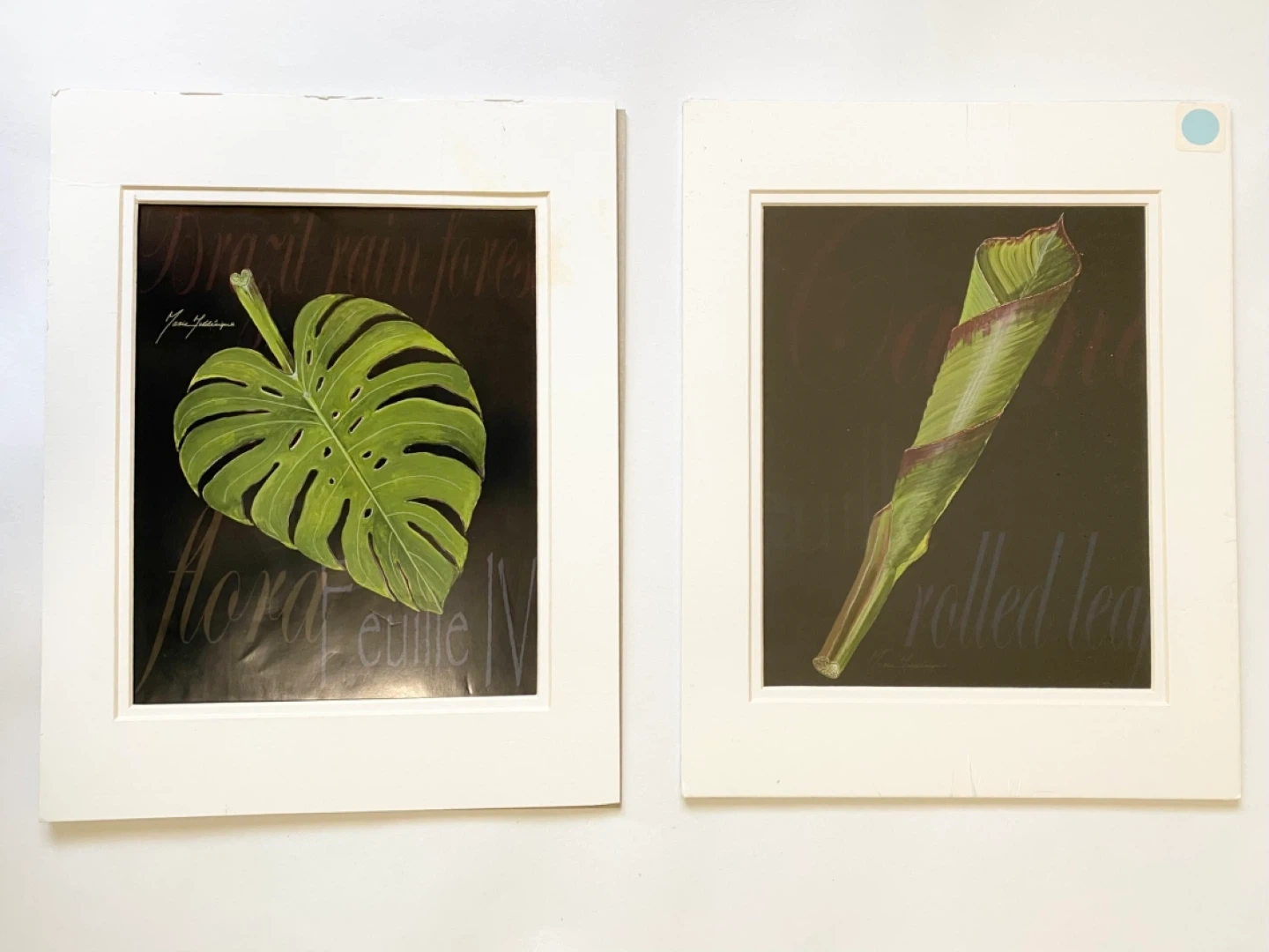 Two framed art prints featuring botanical illustrations. One showcases a Monstera leaf, labelled "Brazil rainforest flora euille N". The other displays a rolled leaf, labelled "rolled leaf". Each piece is signed by artist Marie Fédriqüe. Matting included, frames not specified.