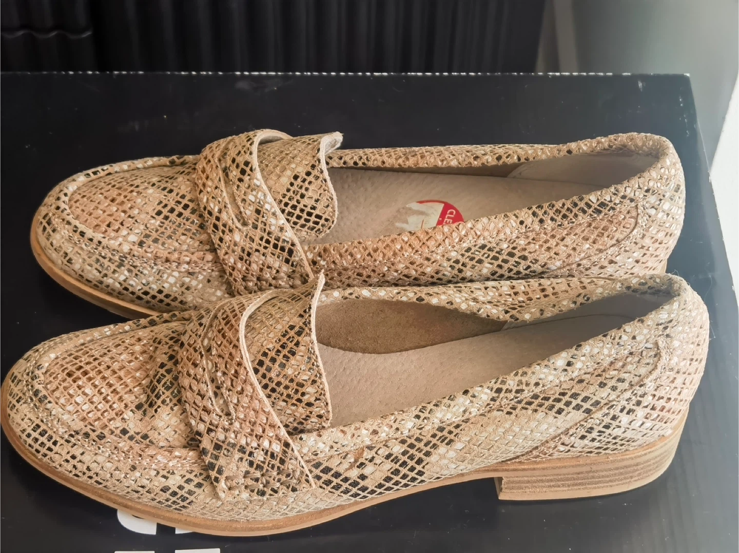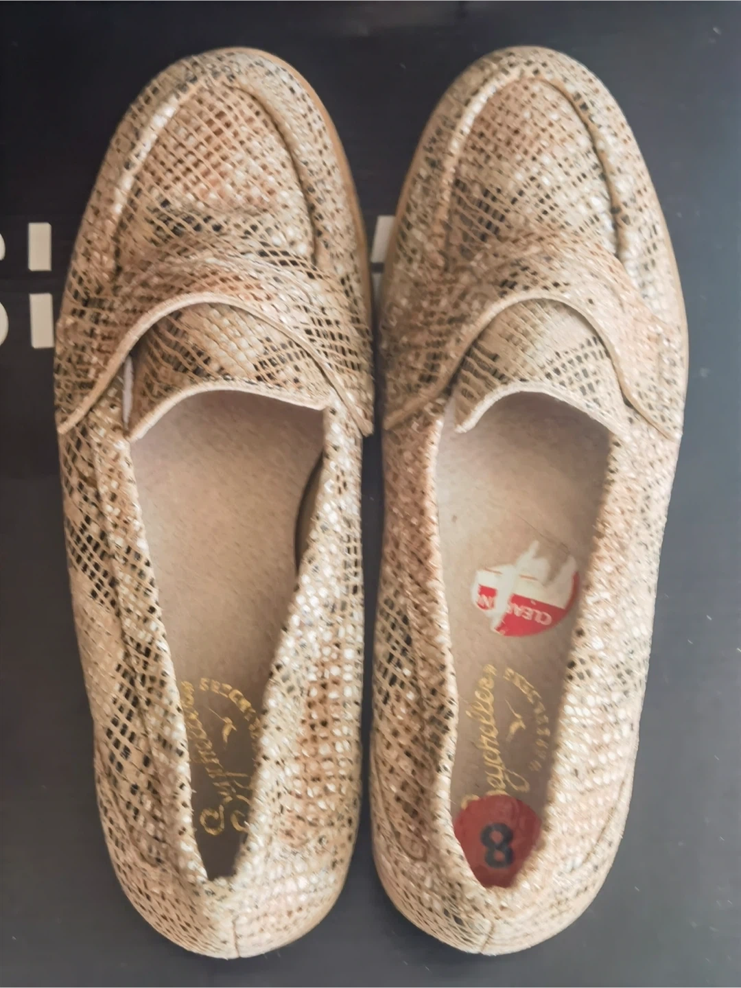 Stylish beige snakeskin print loafers from Joseph Seibel. These shoes feature a comfortable slip-on design with a low heel. Perfect for everyday wear. Size 8.