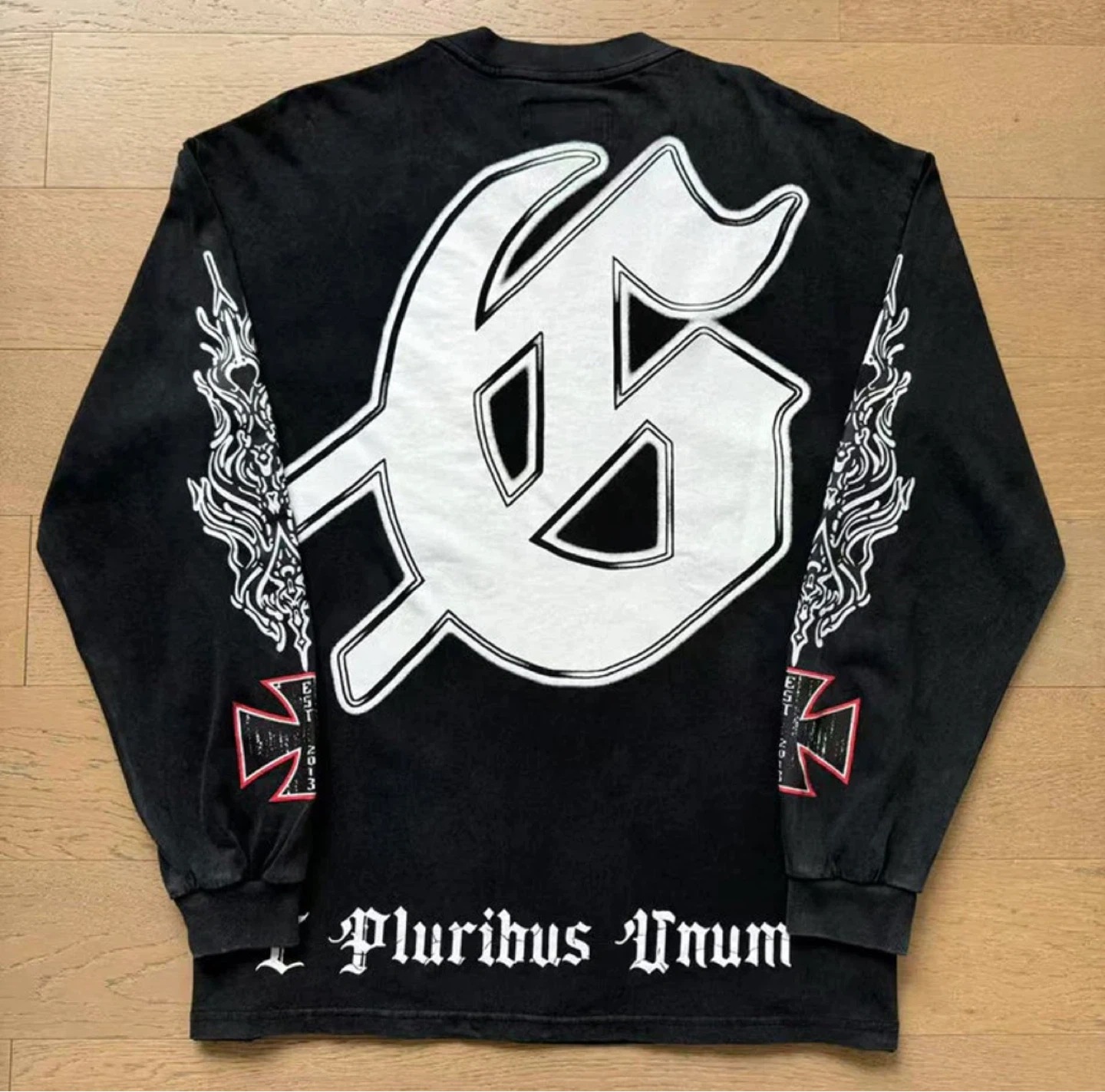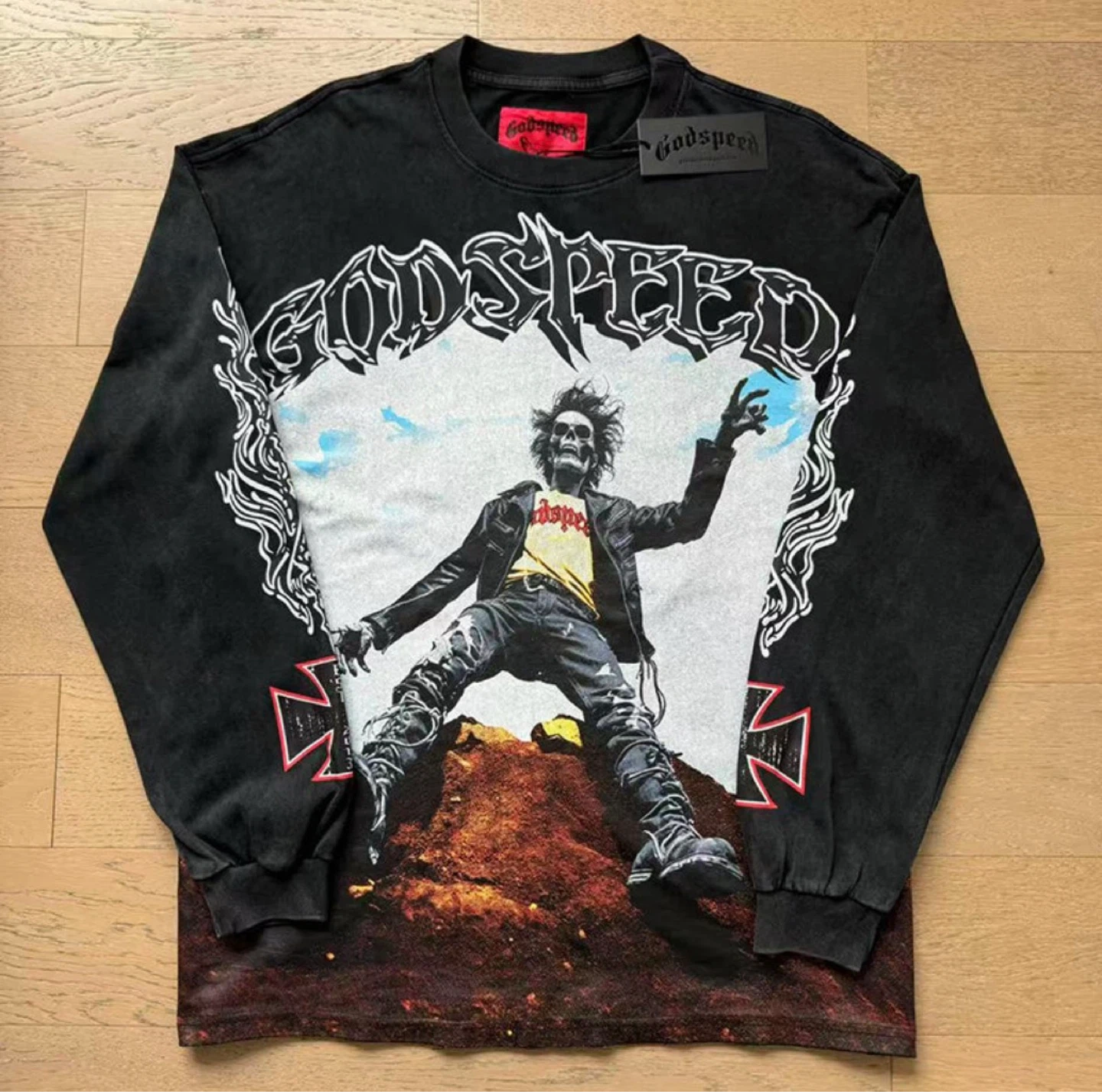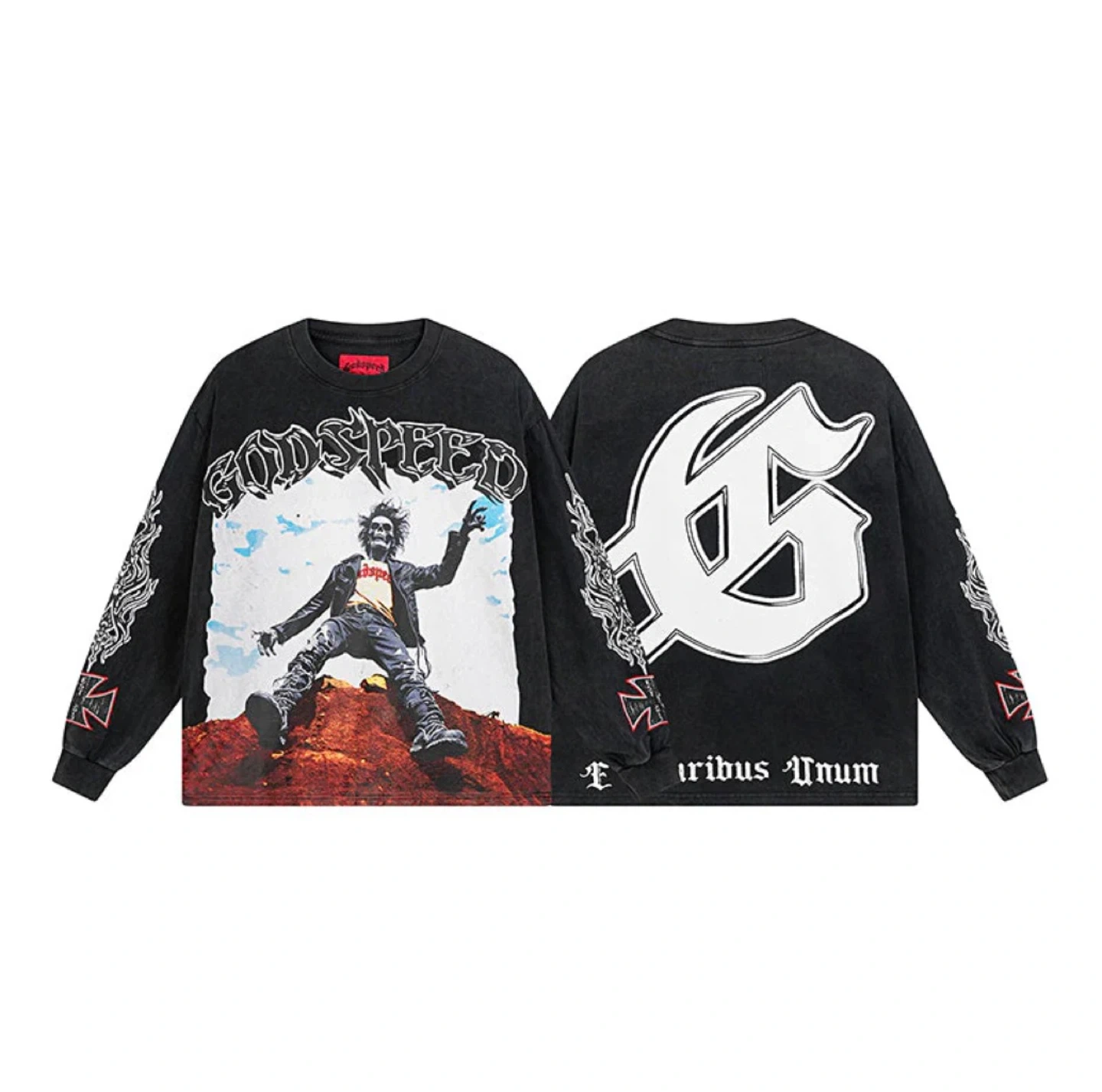 This black long-sleeve t-shirt features a large graphic print on the front with 'GODSPEED' text and a distressed figure. The back has a prominent '6' logo. Made from cotton for comfort. This shirt is great for casual wear.