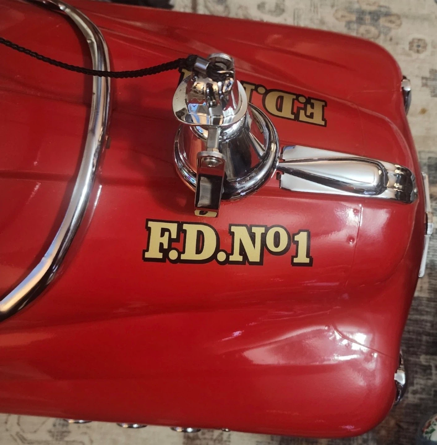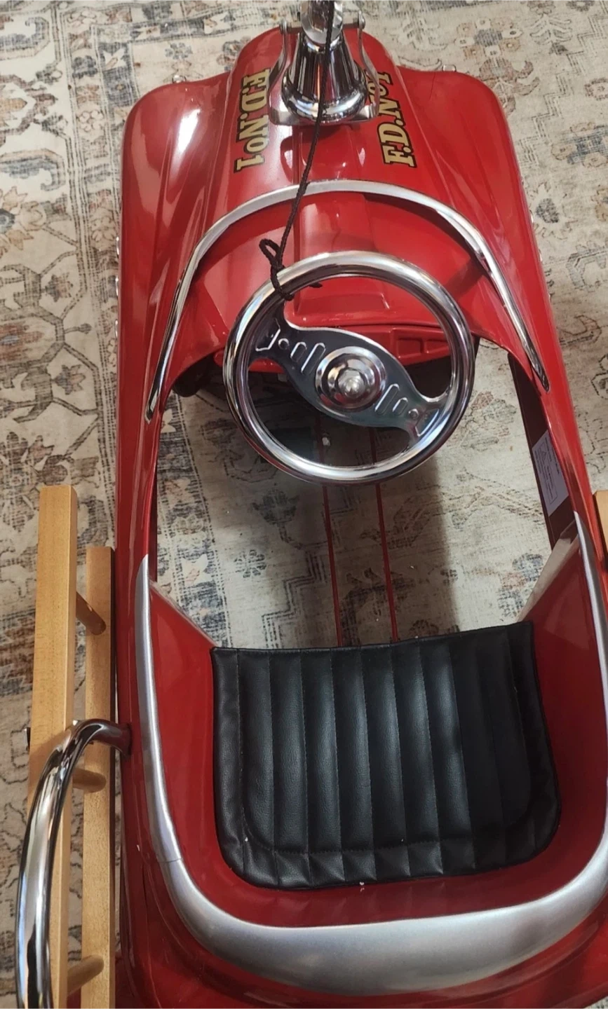 This is a fun red pedal car designed like a fire truck. It has "FIRE FIGHTER" and "FD. NO.1" decals. Includes wooden ladders and chrome accents. It's perfect for little ones who dream of being firefighters!