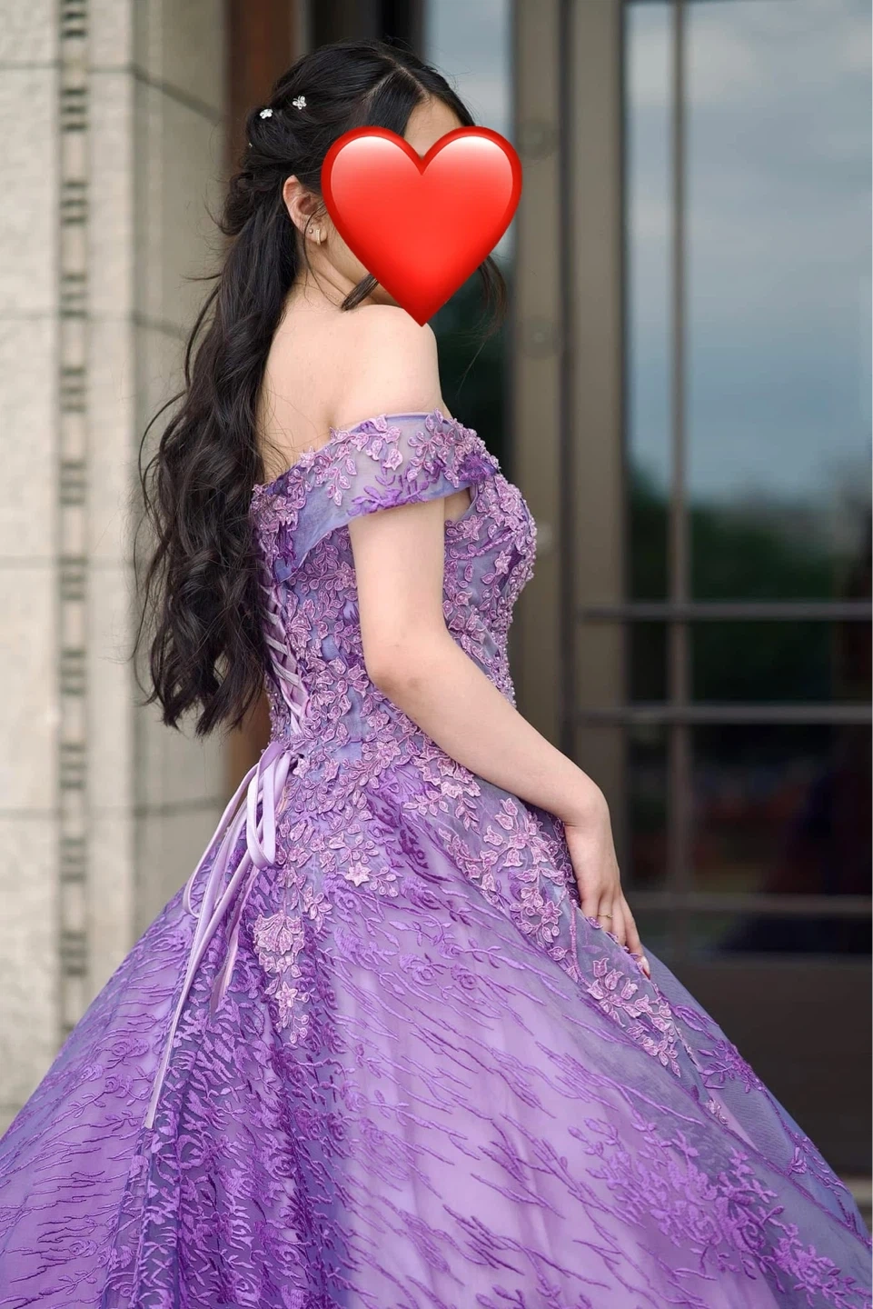 This stunning off-the-shoulder ball gown features intricate lace detailing and a full, flowing skirt. It has a corset back for a customizable fit. It's perfect for formal events or special occasions - debut, grad, prom