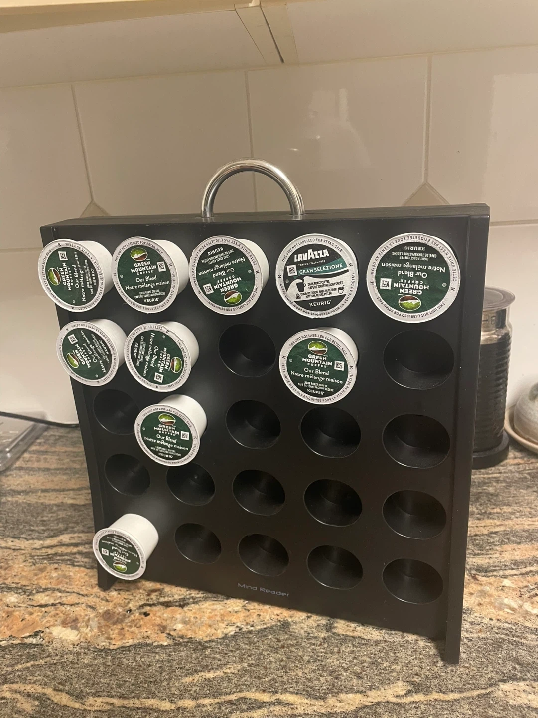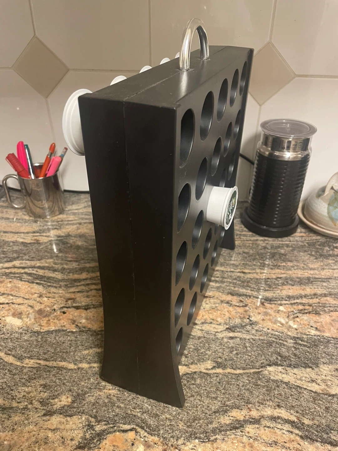 This black Keurig K-Cup holder can store up to 30 coffee pods (2-sided). It's made of durable plastic and has a convenient handle on top for easy transport. Keep your favourite coffee pods organized and accessible!