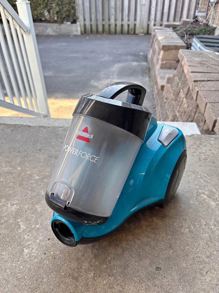 This BISSELL PowerForce Bagless Canister Vacuum works well. It has strong suction and is lightweight and easy to move around. Both tubes are cracked but have been securely taped and are fully usable, as seen in the picture. Selling as is, priced low at $20 due to condition. Great budget option if you just need a working vacuum. Pickup only.