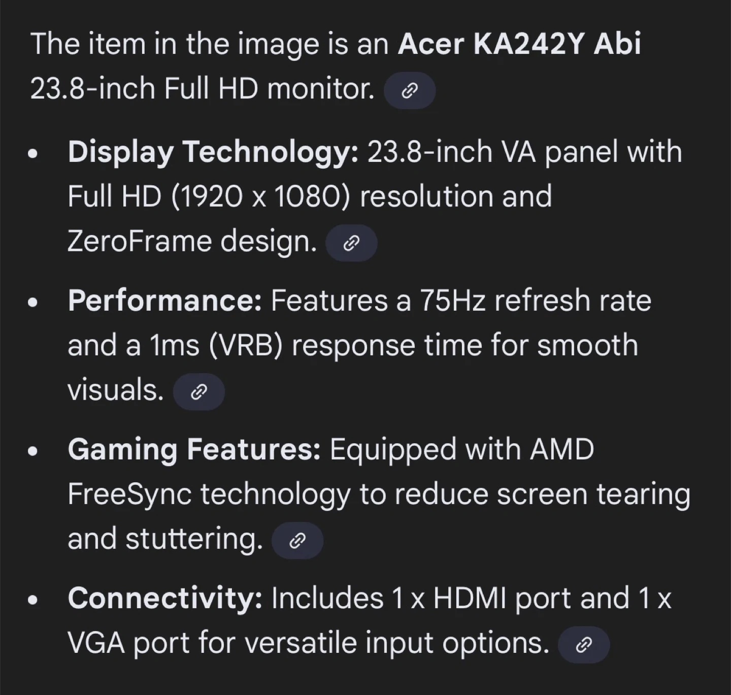 Acer KA242Y Abi 23.8-inch Full HD monitor. It features a VA panel with a 75Hz refresh rate and 1ms response time. It's equipped with AMD FreeSync technology and includes HDMI and VGA ports.