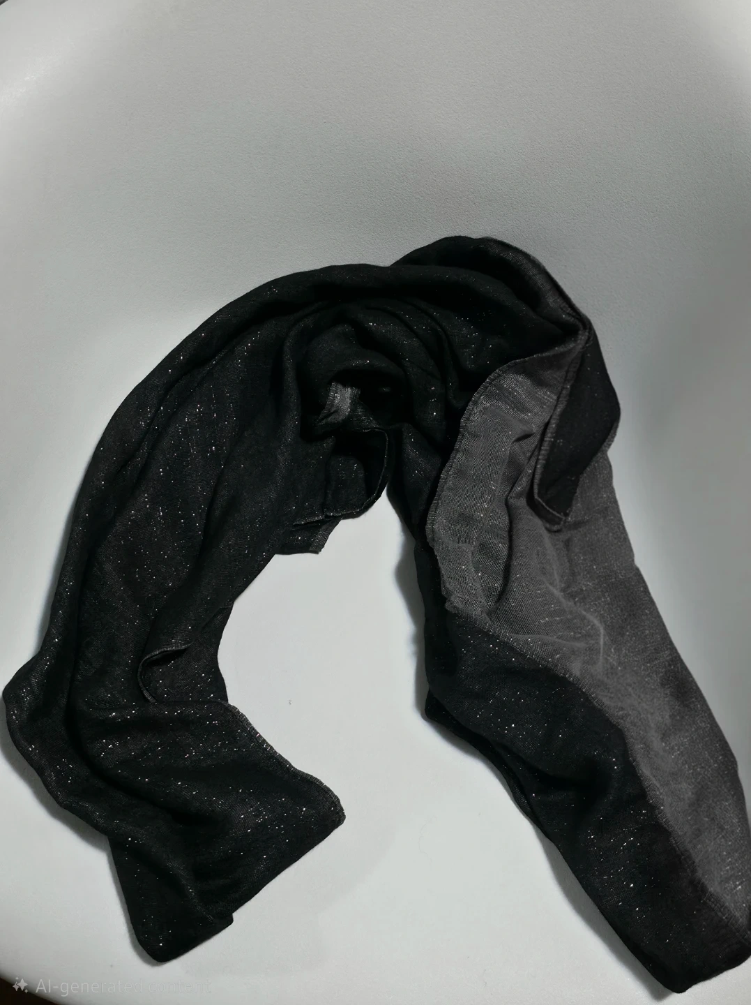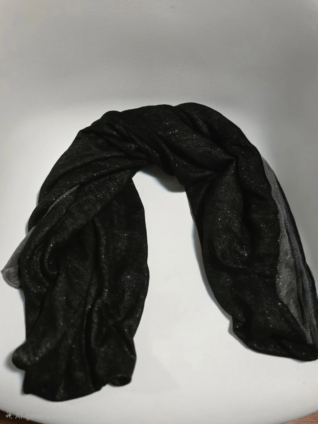 This is a shimmering black scarf with a sparkly, star-like pattern. It's made of a lightweight, sheer material, perfect for adding a touch of glamour to any outfit. The fabric feels soft against the skin.