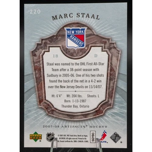 This is a 2007-2008 Artifacts Blue Rookie card of Marc Staal, numbered 03/25. The card is in a penny sleeve and top-loader. Feel free to message if you have any questions!