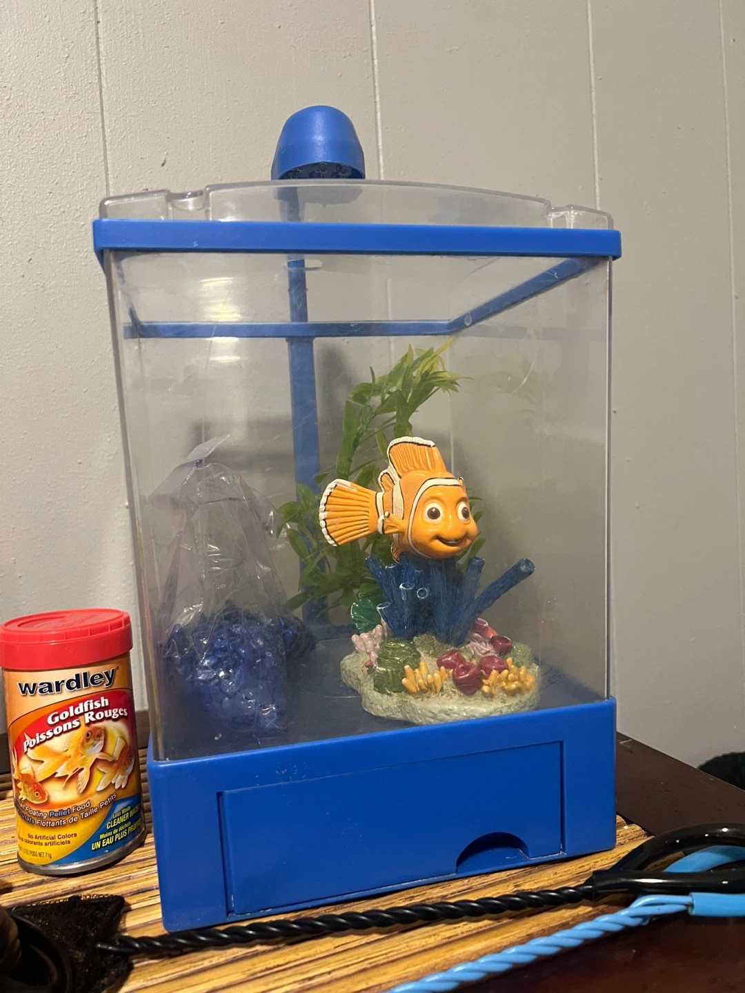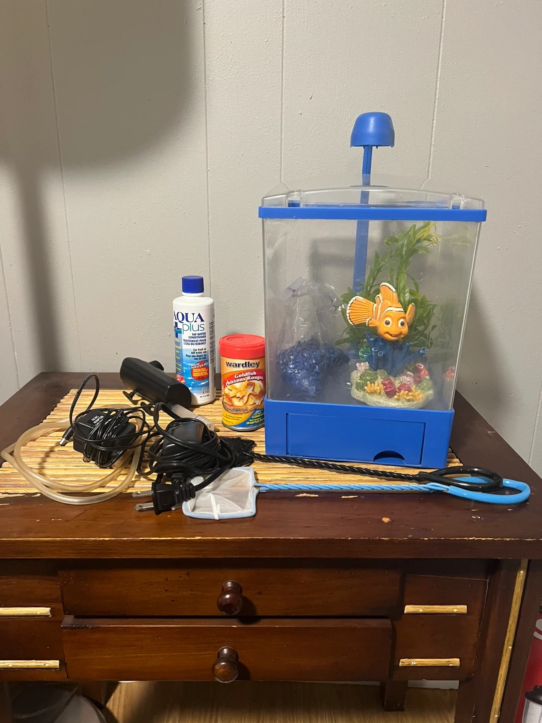 Selling a complete fish tank setup! It comes with everything you need to get started. Included are the tank, a filter, gravel, decorations, fish food (Wardley Goldfish), and Aqua Plus water conditioner. Perfect for a small fish or beginner!