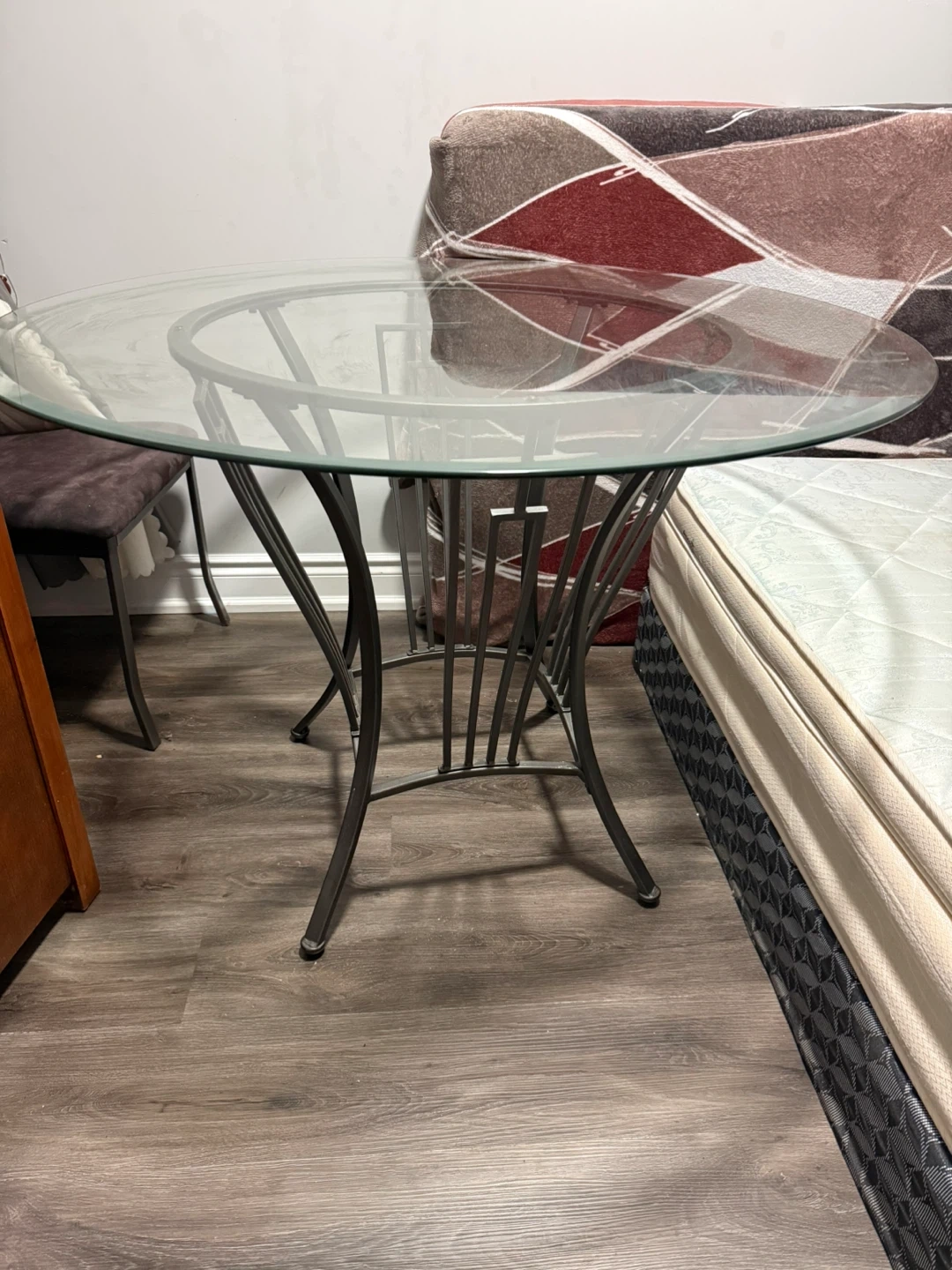 Selling a glass top dining table with two matching chairs. The table features a sleek, modern design with a metal frame. The chairs have a comfortable, upholstered seat. It's in good condition and would be a great addition to any dining space!