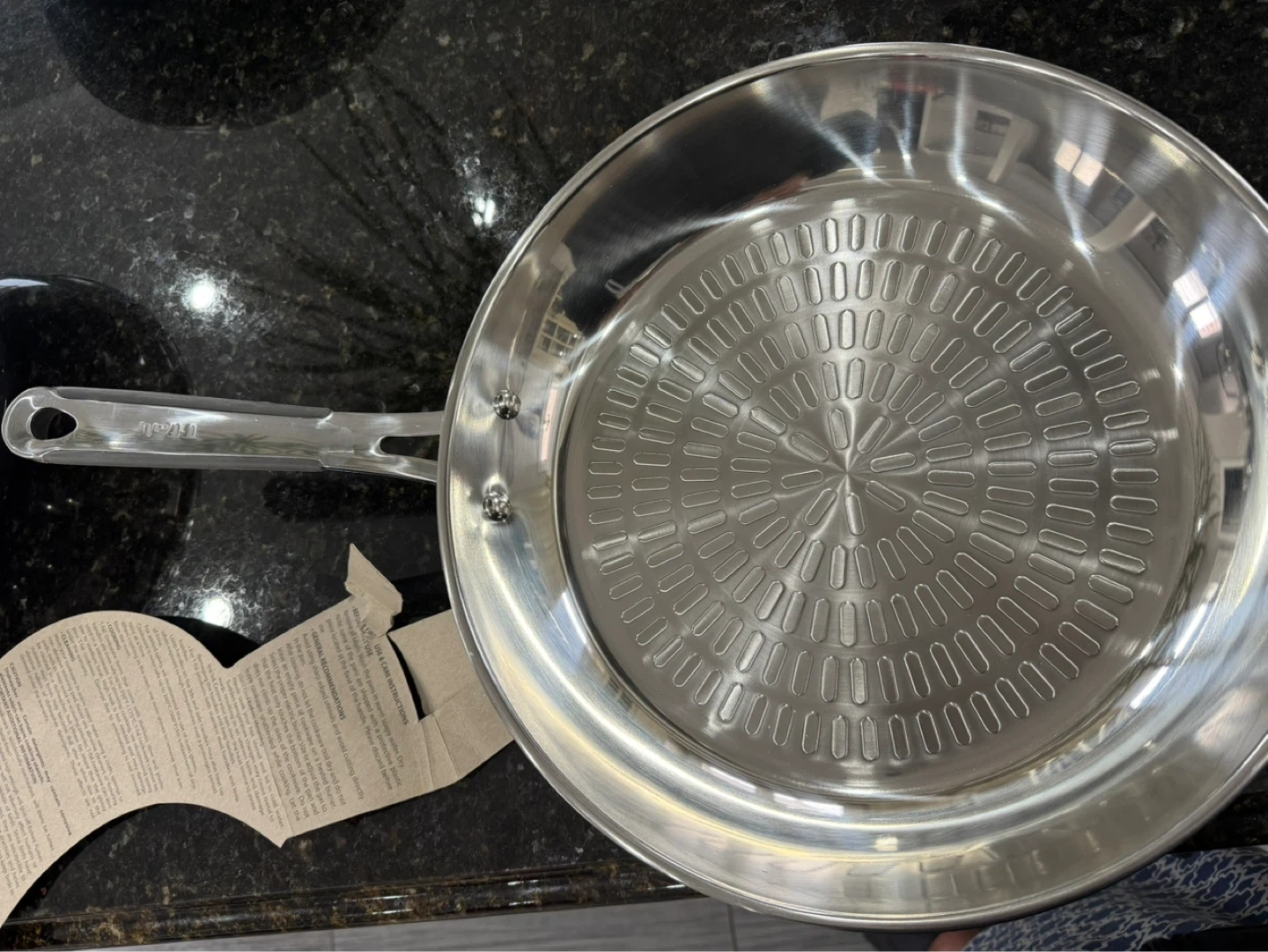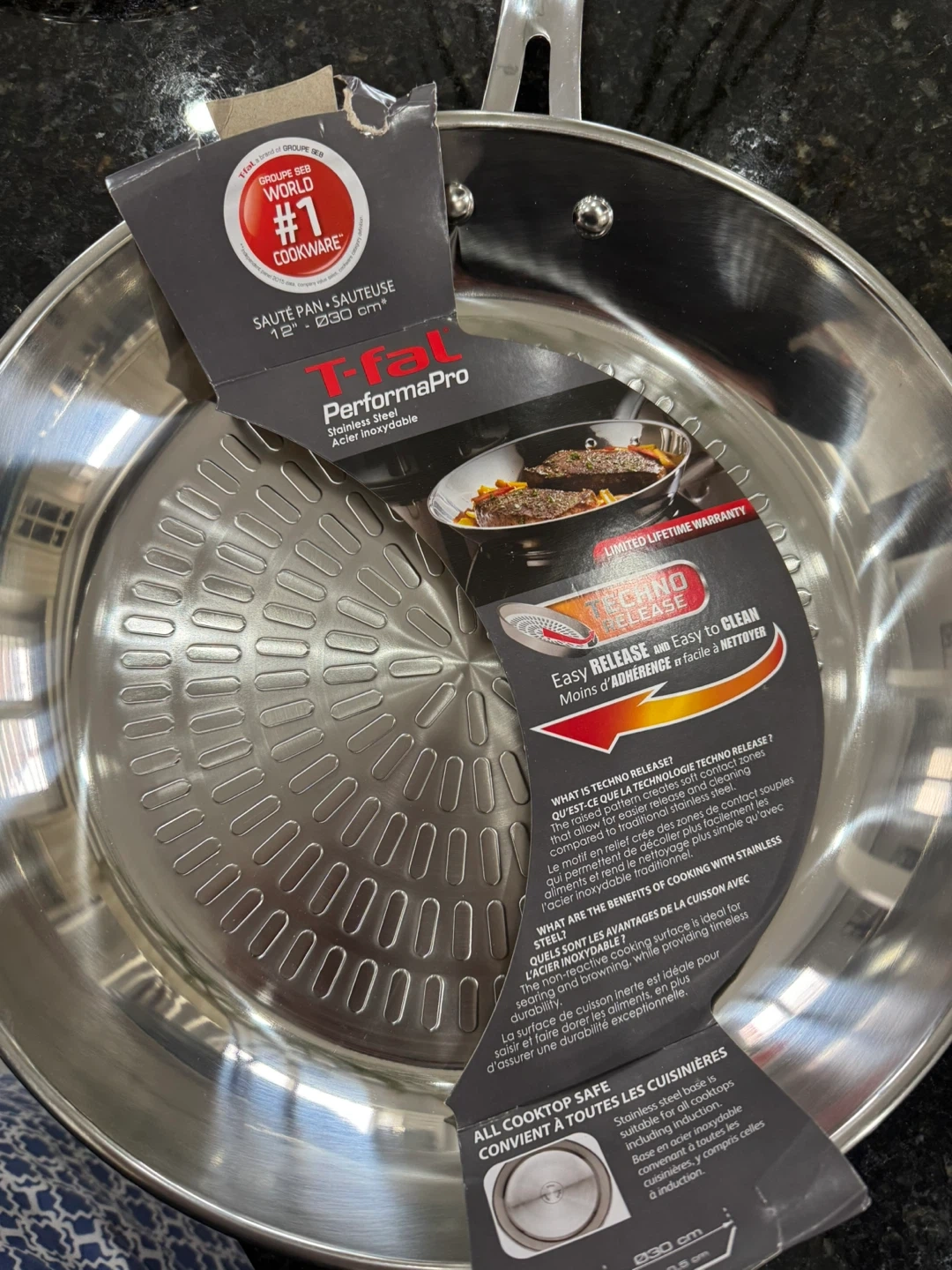 Upgrade your kitchen with this T-fal Performpro 12" stainless steel fry pan! Designed for even heating and lasting durability, it's perfect for all your culinary creations and is in new condition. Here are some details about the pan: * Brand: T-fal * Material: Stainless Steel * Size: 12 inch * Model: Performpro If you're seeing this ad, it's still up for grabs.