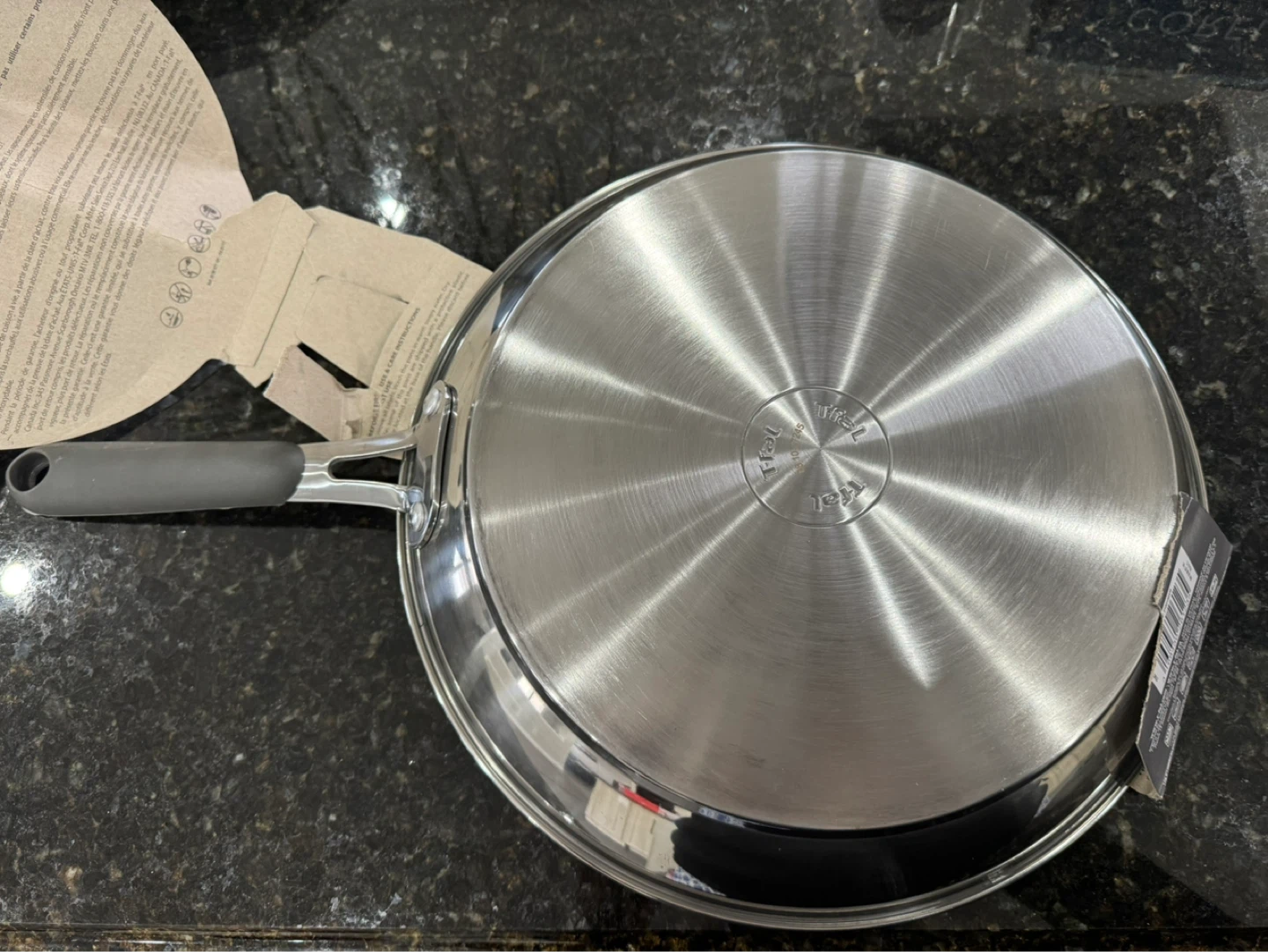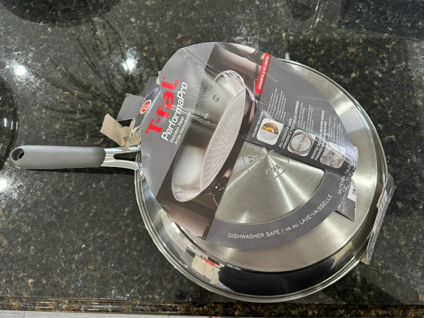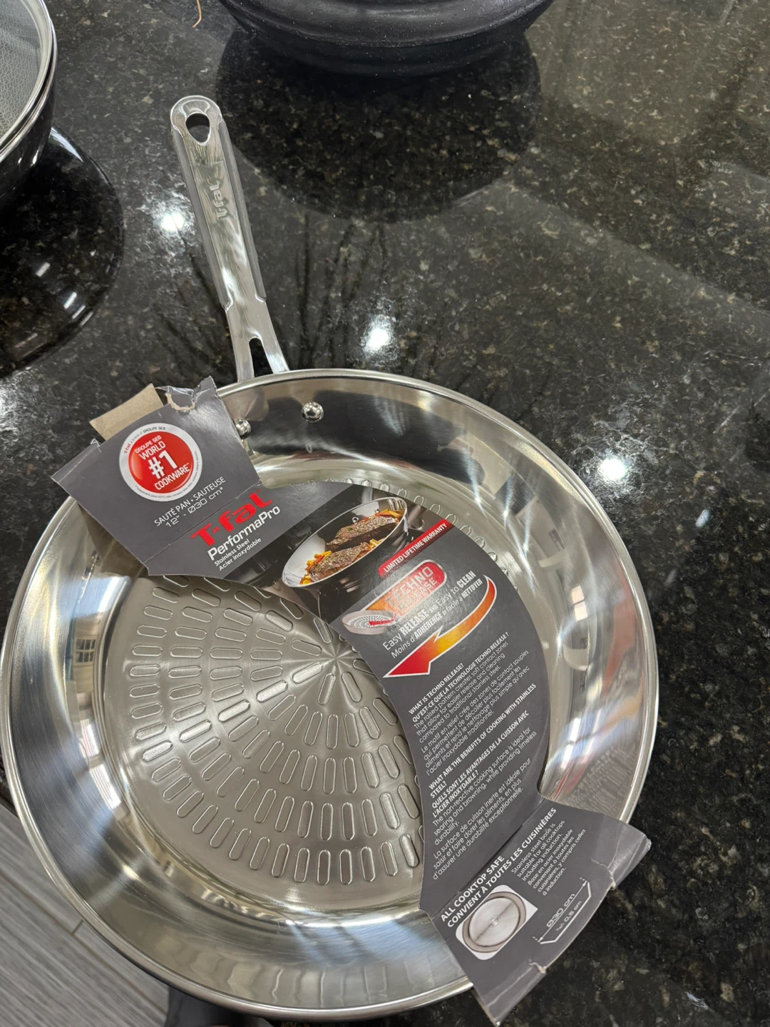 Upgrade your kitchen with this T-fal Performpro 12" stainless steel fry pan! Designed for even heating and lasting durability, it's perfect for all your culinary creations and is in new condition. Here are some details about the pan: * Brand: T-fal * Material: Stainless Steel * Size: 12 inch * Model: Performpro If you're seeing this ad, it's still up for grabs.