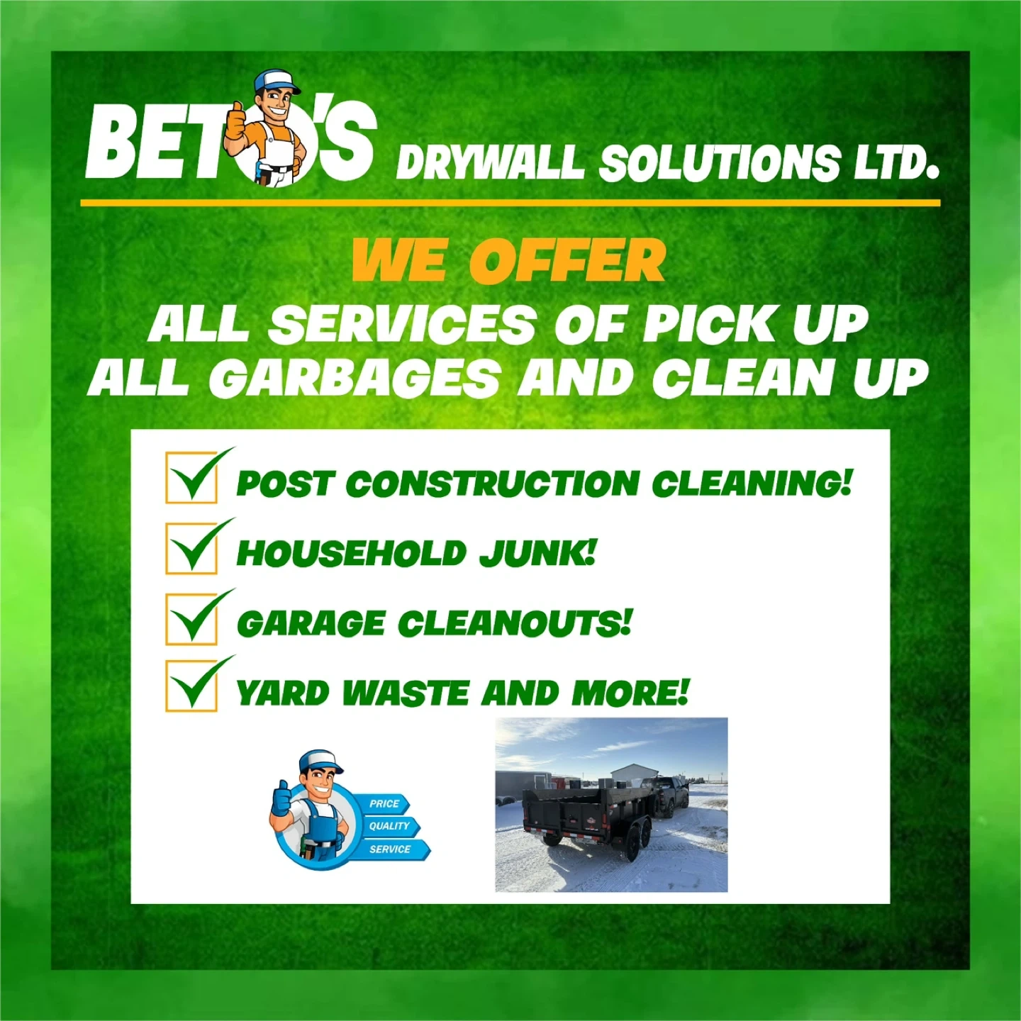 Need reliable help cleaning up your space? Bet’s Drywall Solutions Ltd. offers professional garbage pickup and cleanup services for homes, garages, yards, and construction sites.