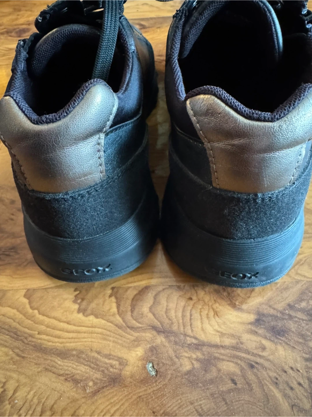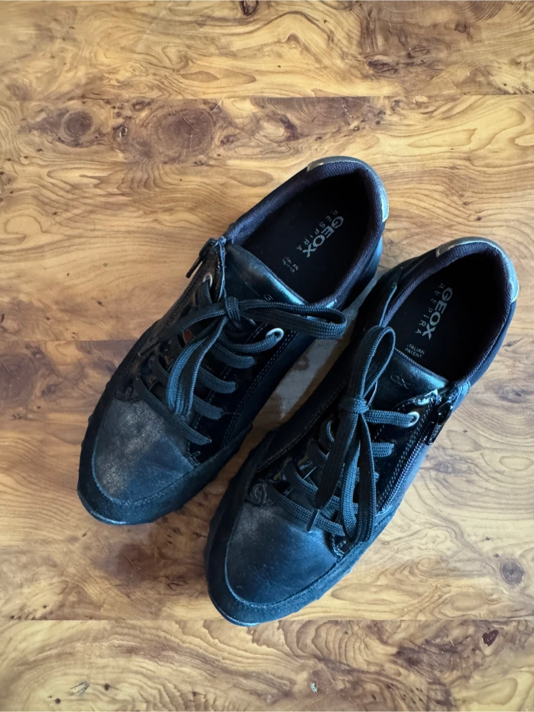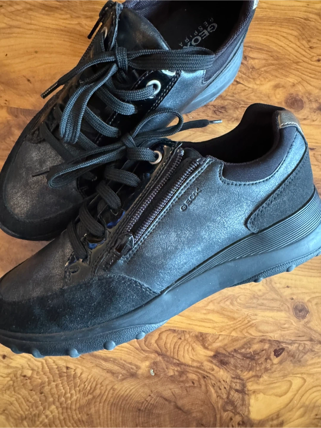 Geox Respira black sneakers featuring a mix of leather and suede. These shoes have a side zipper and lace-up closure. Size 38 EUR / 8 US.