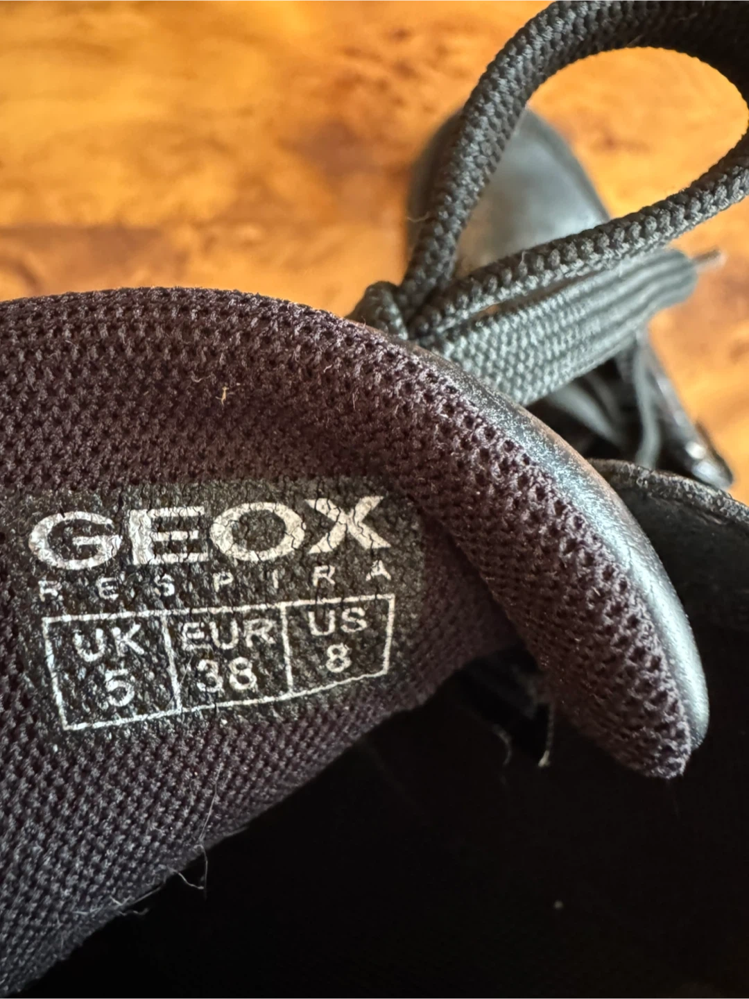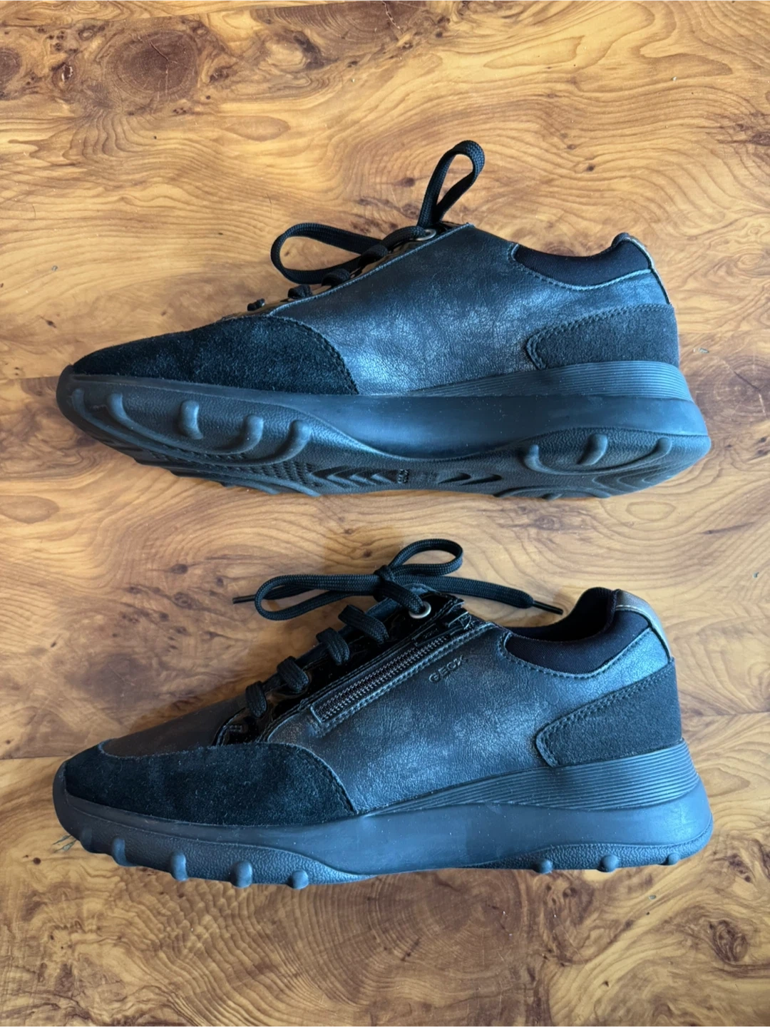 Geox Respira black sneakers featuring a mix of leather and suede. These shoes have a side zipper and lace-up closure. Size 38 EUR / 8 US.