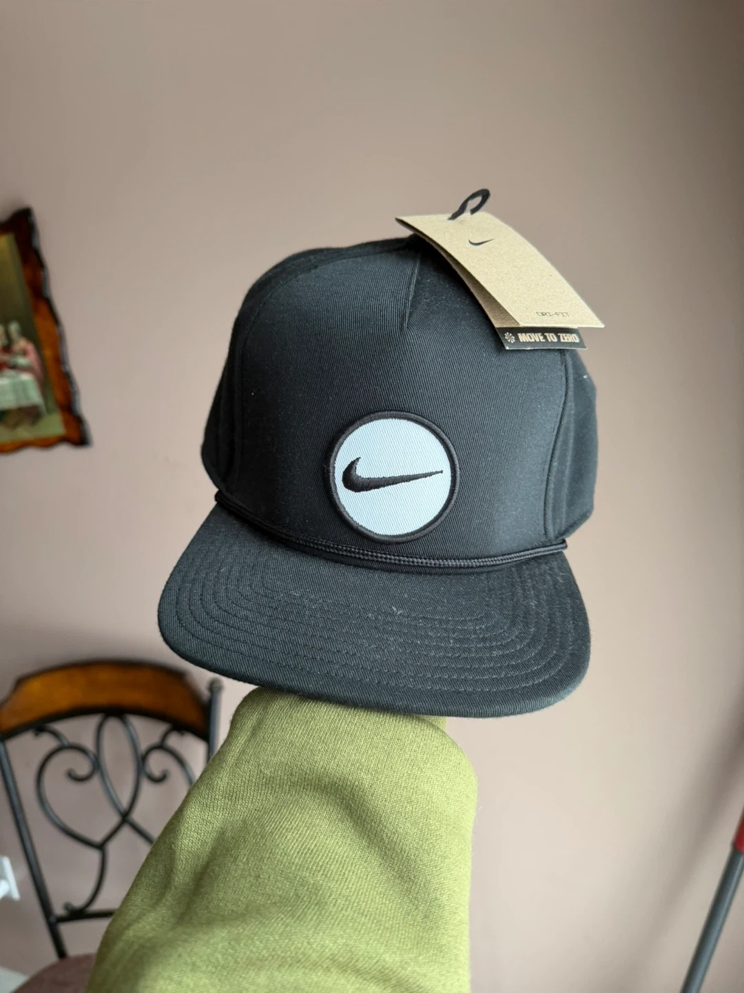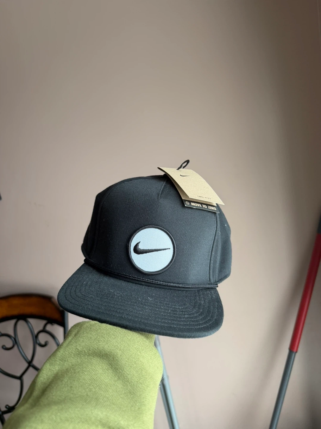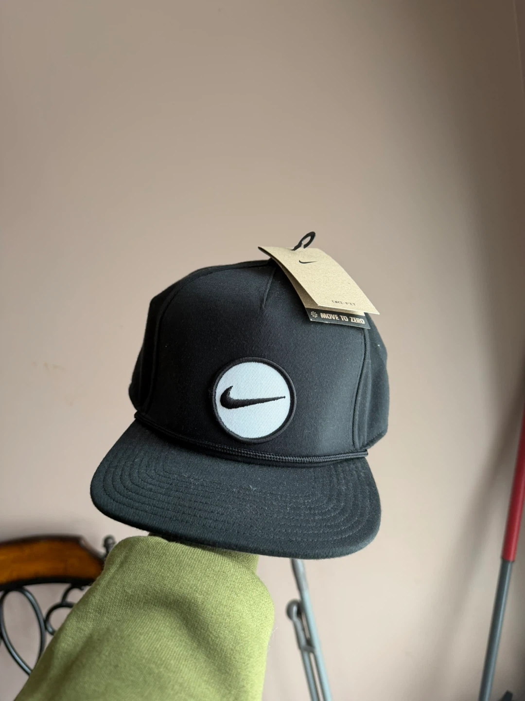 Black Nike baseball cap with "Move to Zero" tag. Features a classic snapback design. Made from durable fabric. Adjustable strap for a comfortable fit.