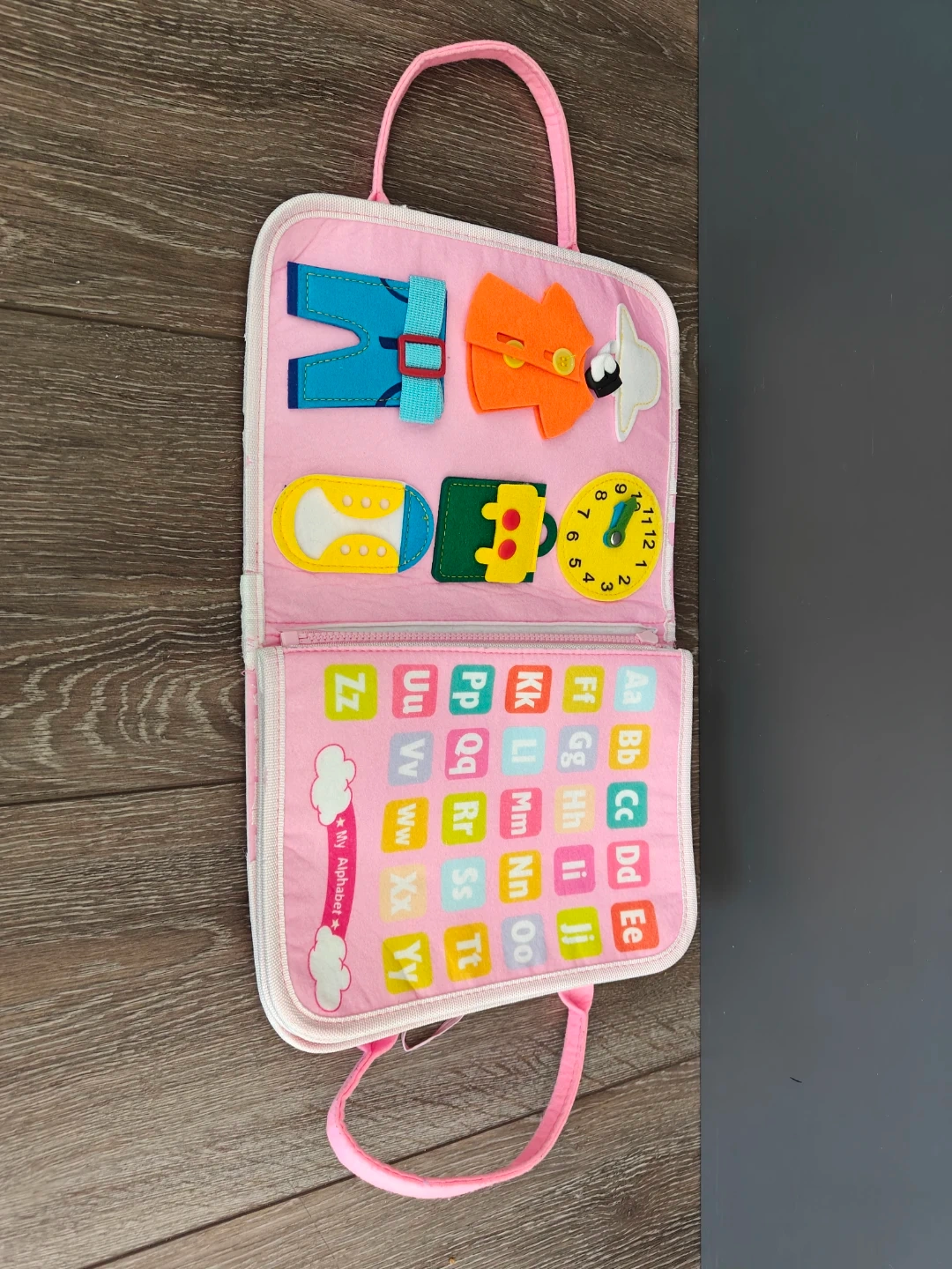 This soft activity book is designed for little ones to learn numbers, colours, shapes, weather, and the alphabet. It features buckles, zippers, and felt pieces for hands-on engagement.