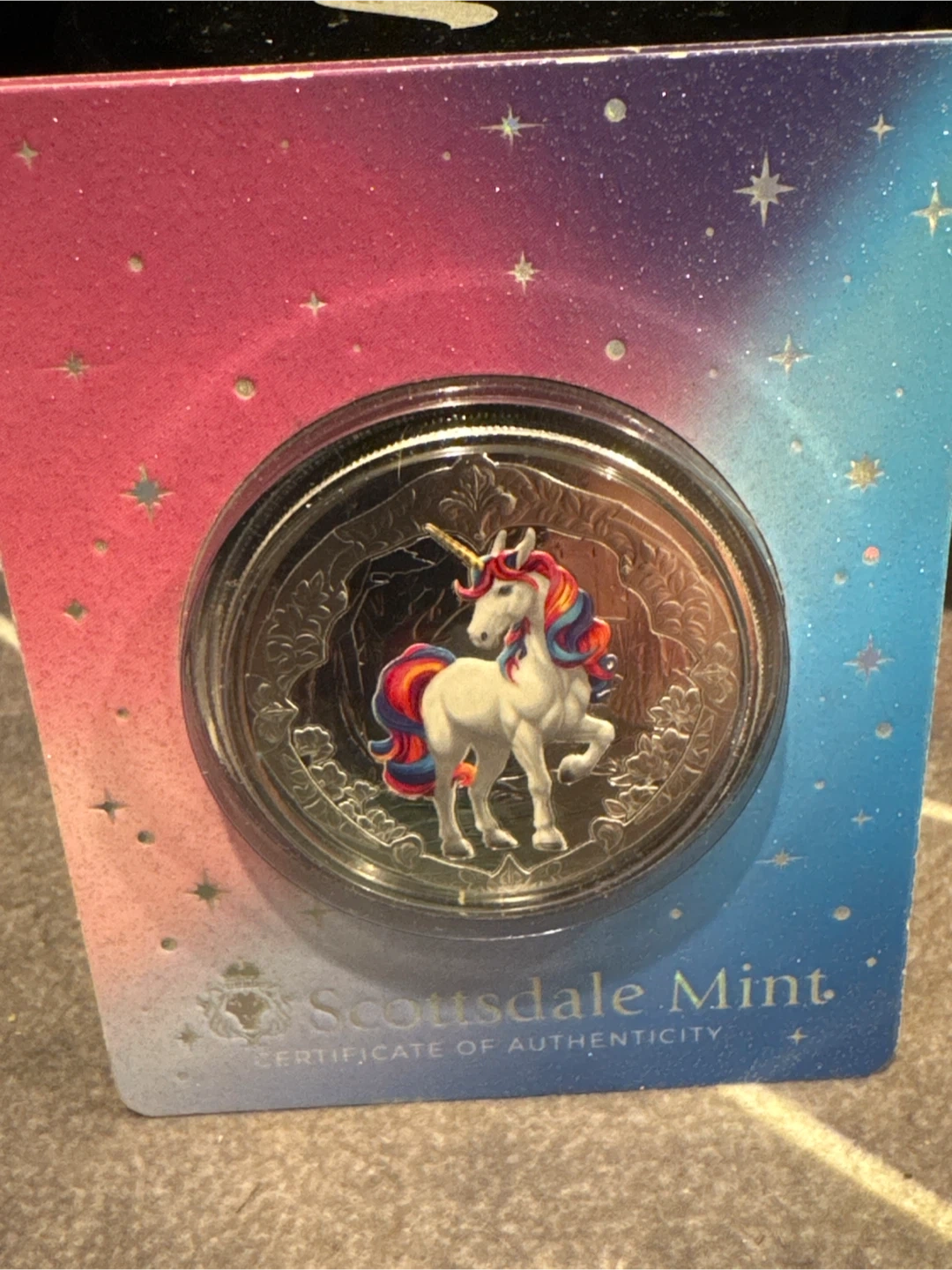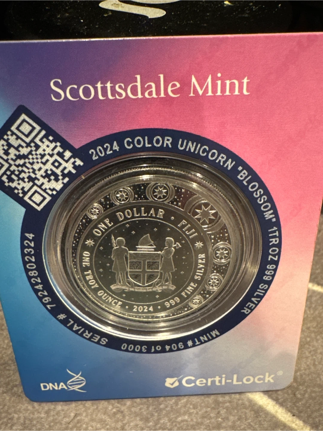 Selling a Scottsdale Mint 2024 Color Unicorn "Blossom" coin. It's in great condition and comes with its Certificate of Authenticity. This coin is Fiji One Dollar, contains one troy ounce of 999 fine silver. Mint #904 of 3000. Serial #79242802324