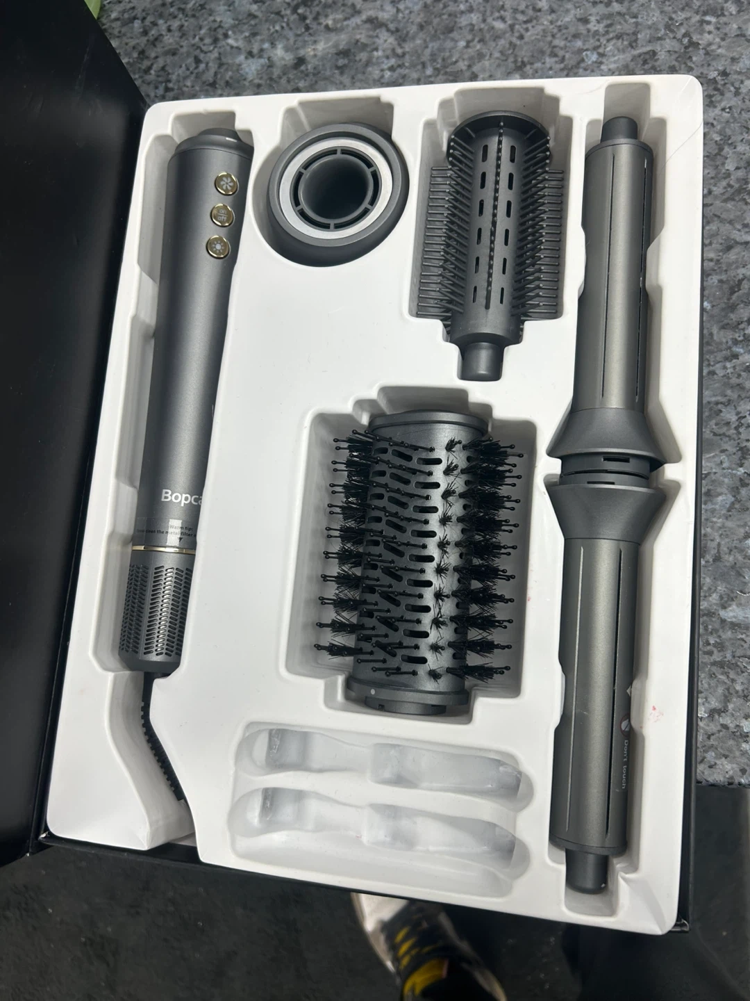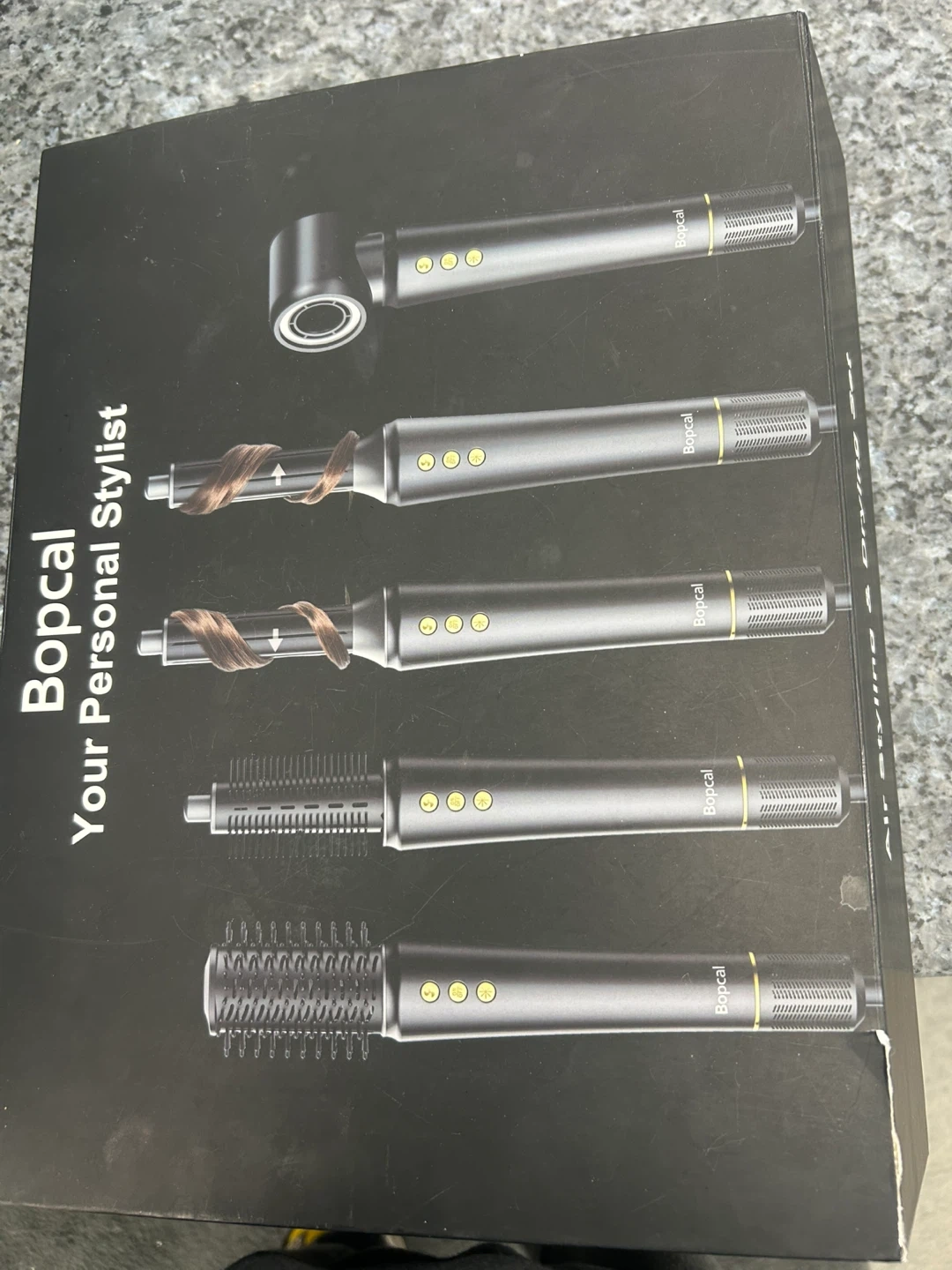 This Bopcal hair styler set comes with five interchangeable attachments for versatile styling. It includes a blow dryer brush, curling wands, and smoothing brushes. The unit is grey and includes all original packaging and accessories. Was used couple times my daughter doesn’t want it looking to sell flake offer
