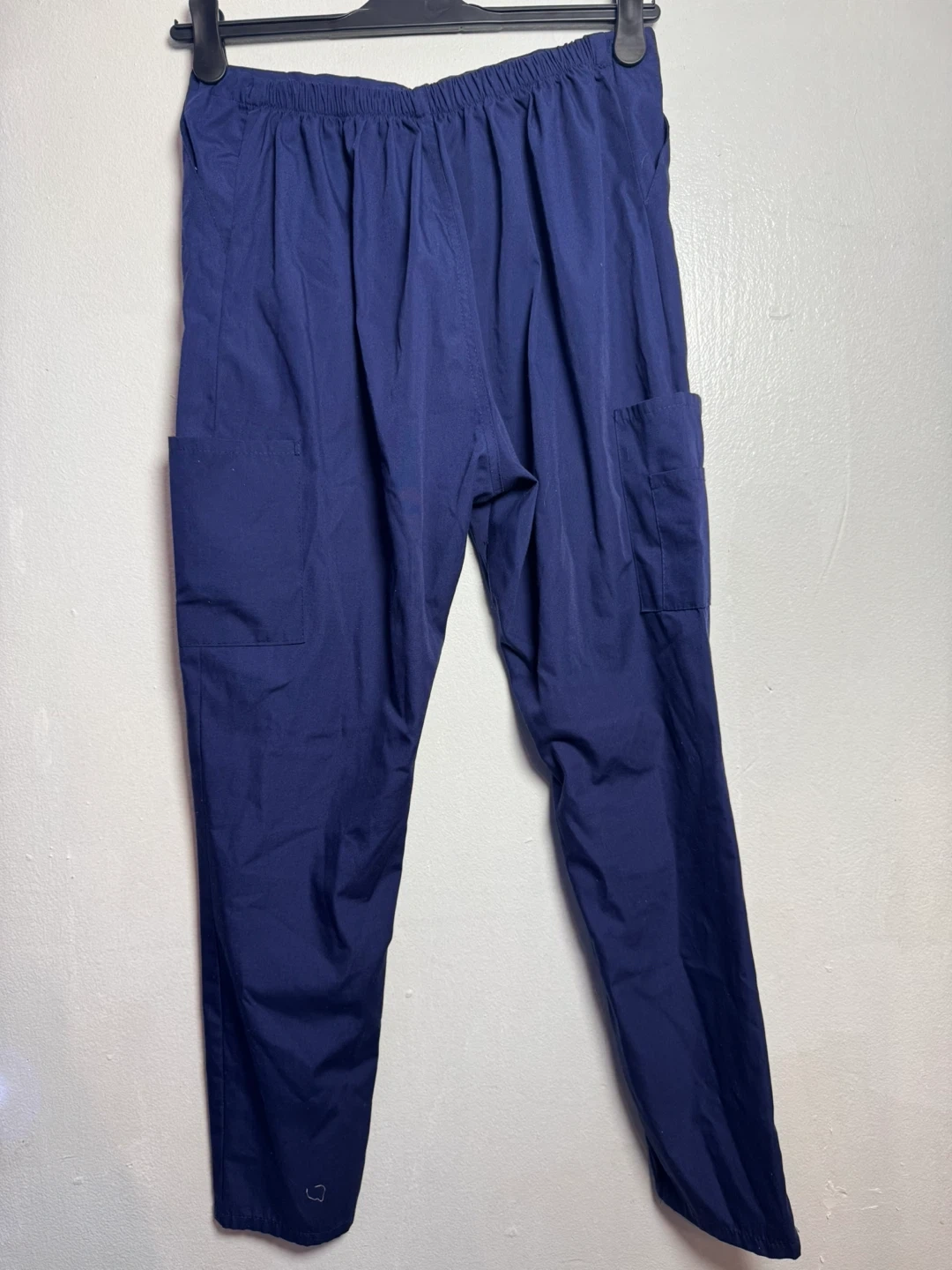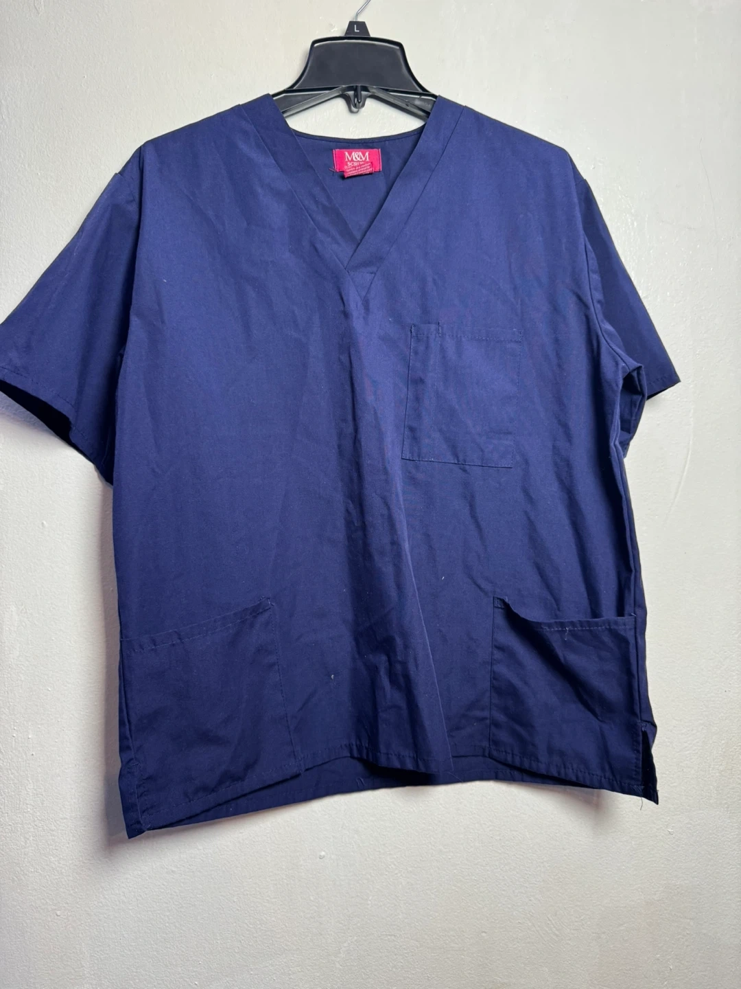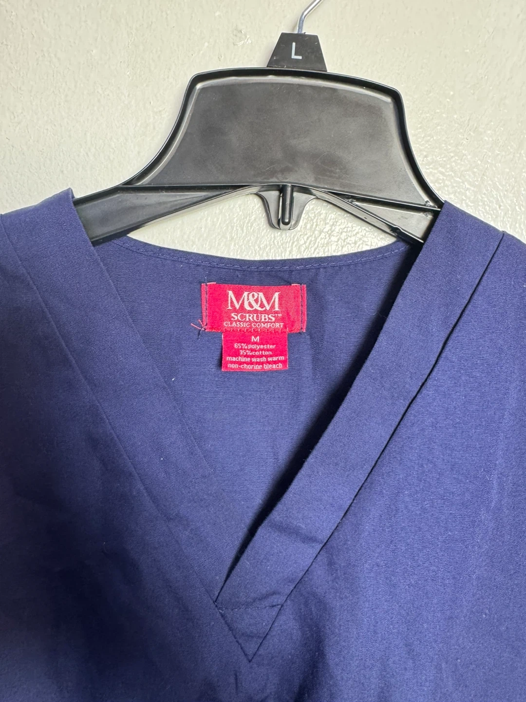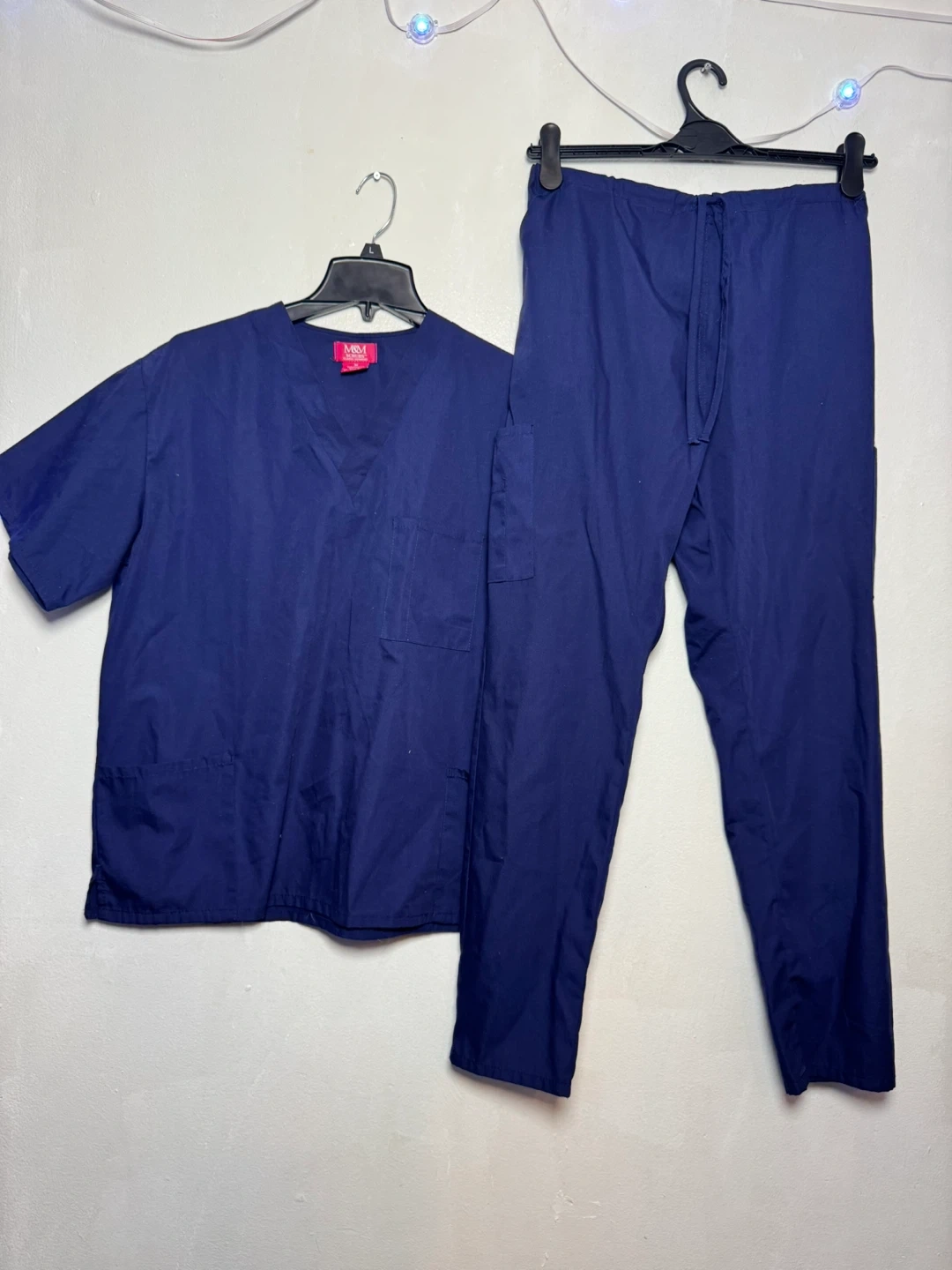 This is a two-piece M&M Scrubs set in navy blue. It includes a v-neck scrub top and drawstring scrub pants. The fabric is 65% polyester and 35% cotton. Machine wash warm, non-chlorine bleach. Size medium.