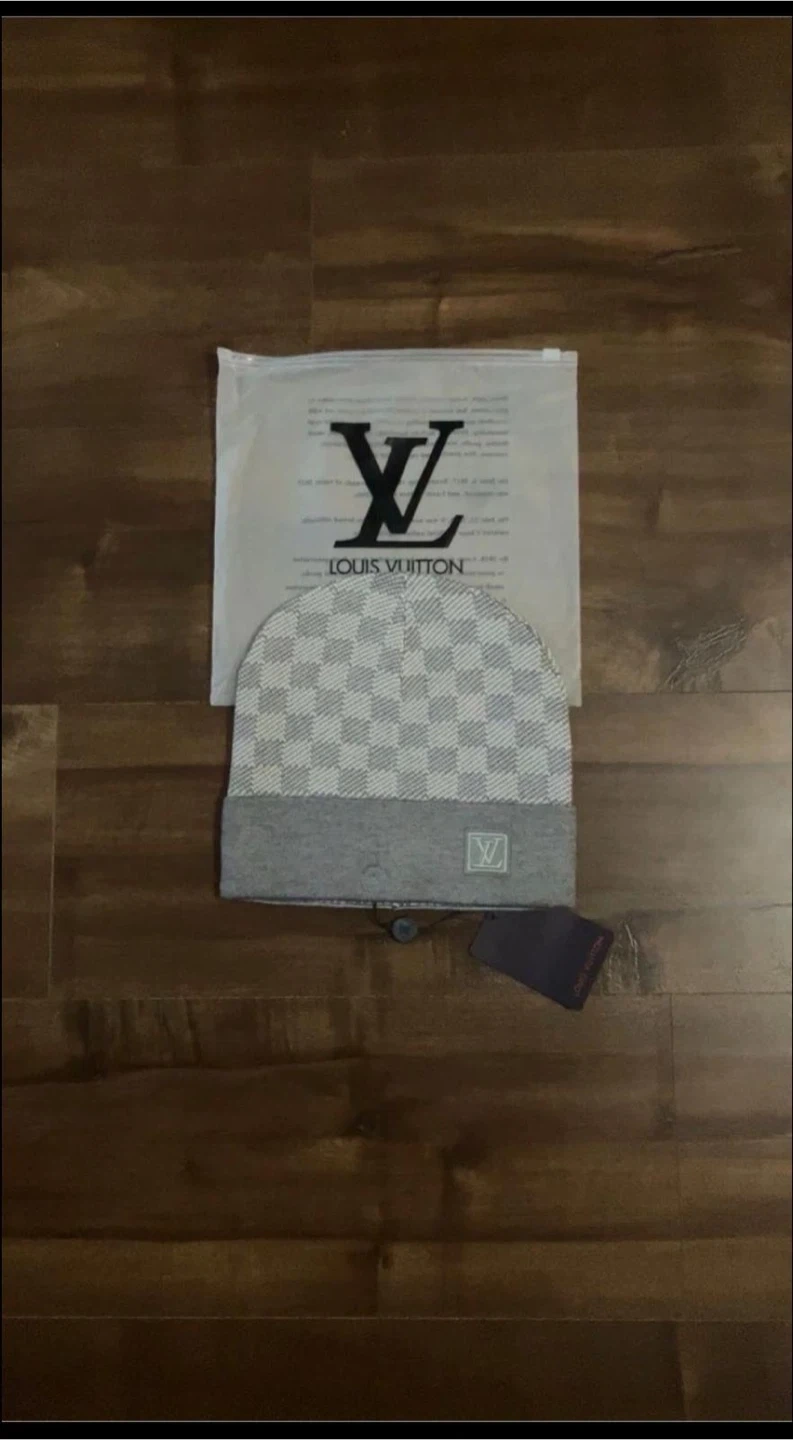 Selling a Louis Vuitton beanie in the Damier Azur pattern. It's in great condition and comes with the original packaging!