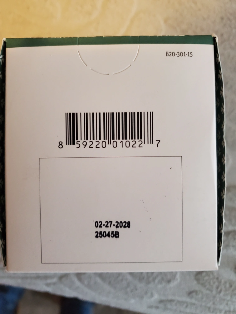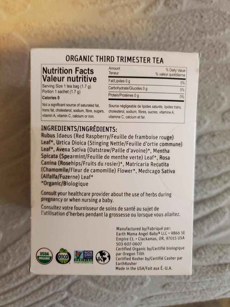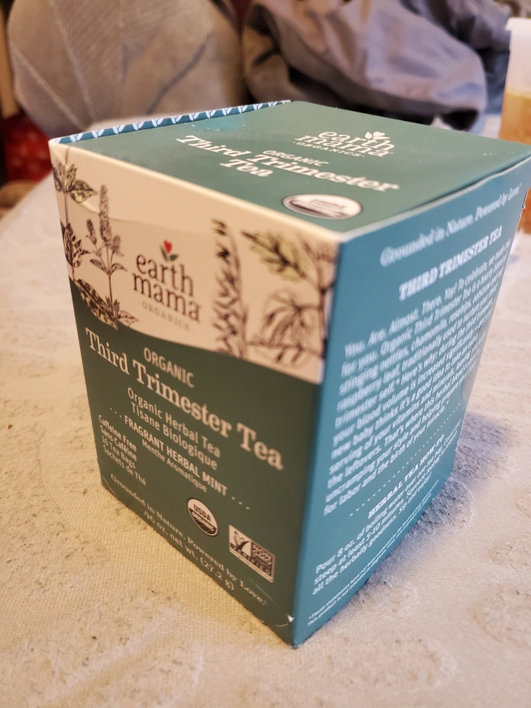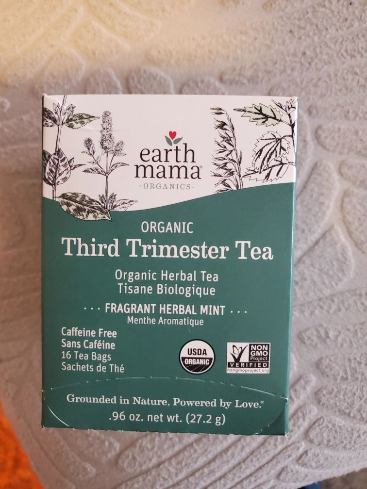 Organic herbal tea, formulated for expecting mothers. Caffeine-free and fragrantly herbal mint. Expiration date is February 27, 2028.