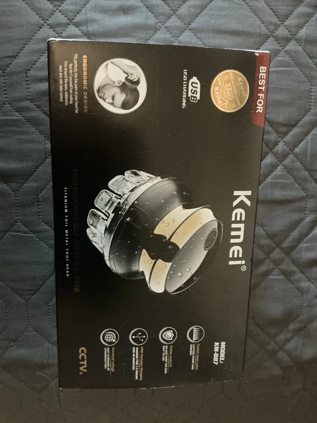 This Kemei KM-887 is a professional self-service hair clipper with an ergonomic design for easy handling. It features USB portable charging, a carbon steel cutter that's sharp and durable, and a safety material that won't hurt the skin. It charges for 1.5 hours and provides 60 minutes of use.