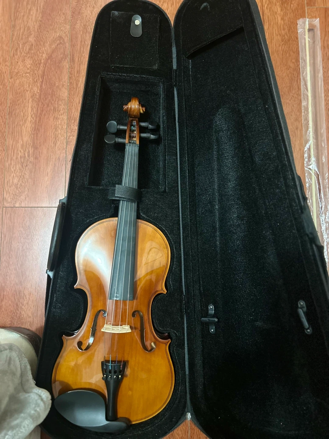 This is a violin, complete with a hard-shell case and accessories. It comes with rosin, a bow, and a clip-on tuner. The tuner's brand is MT-01A.
