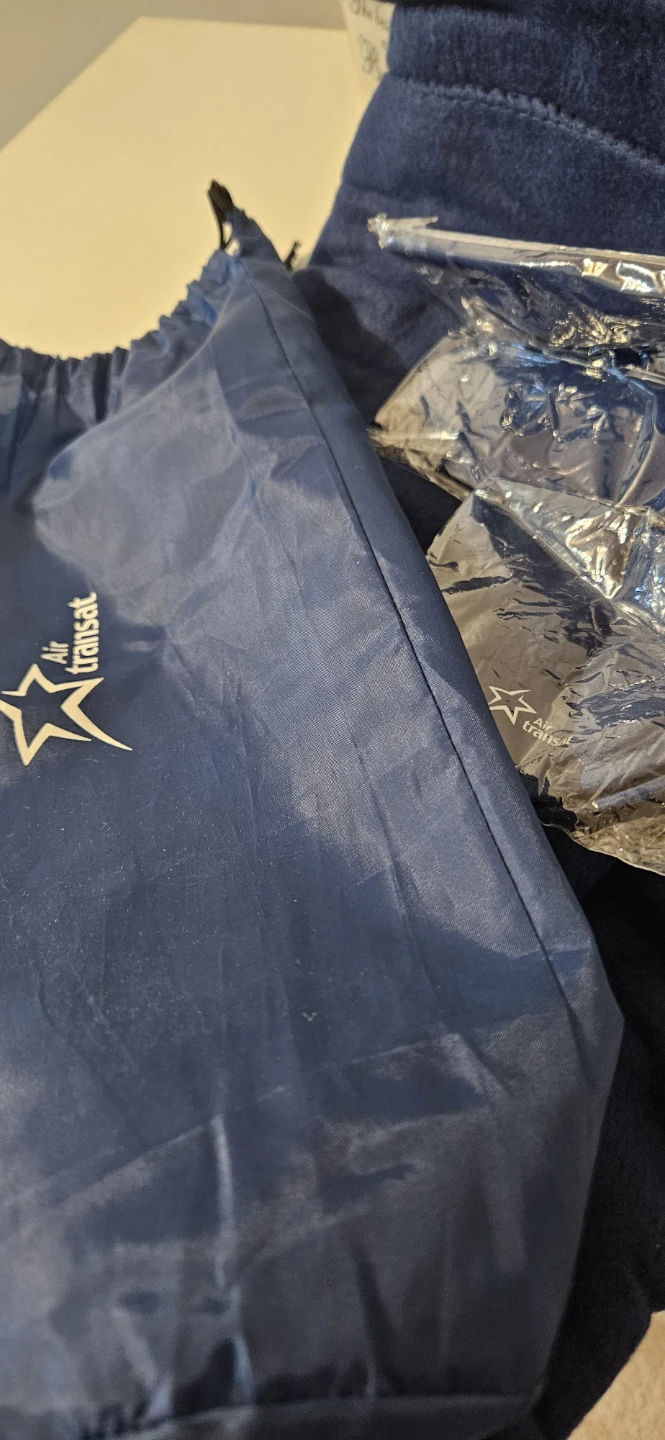 π₯ Warm Air Transat blue travel blanket, includes drawstring bag. Soft fleece material with eye cover and travelling pillow
