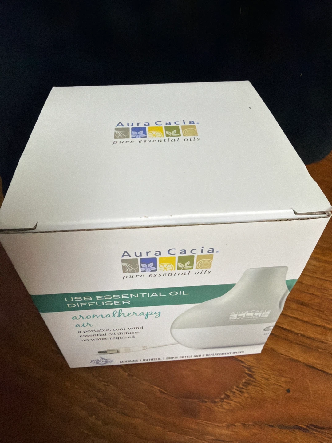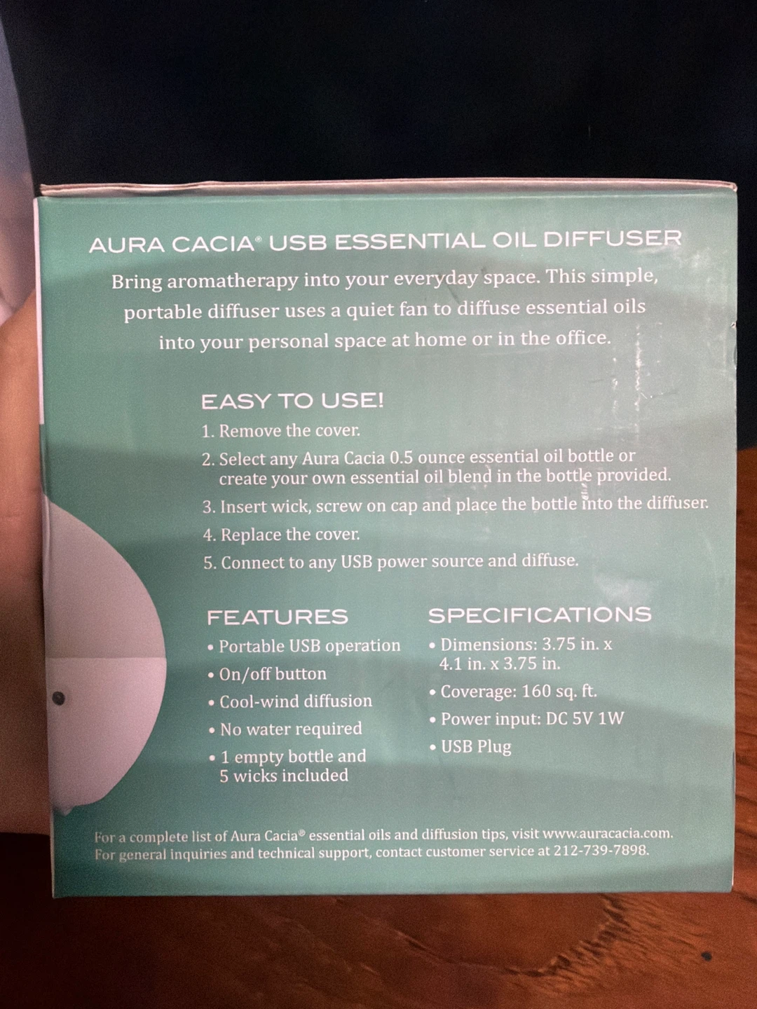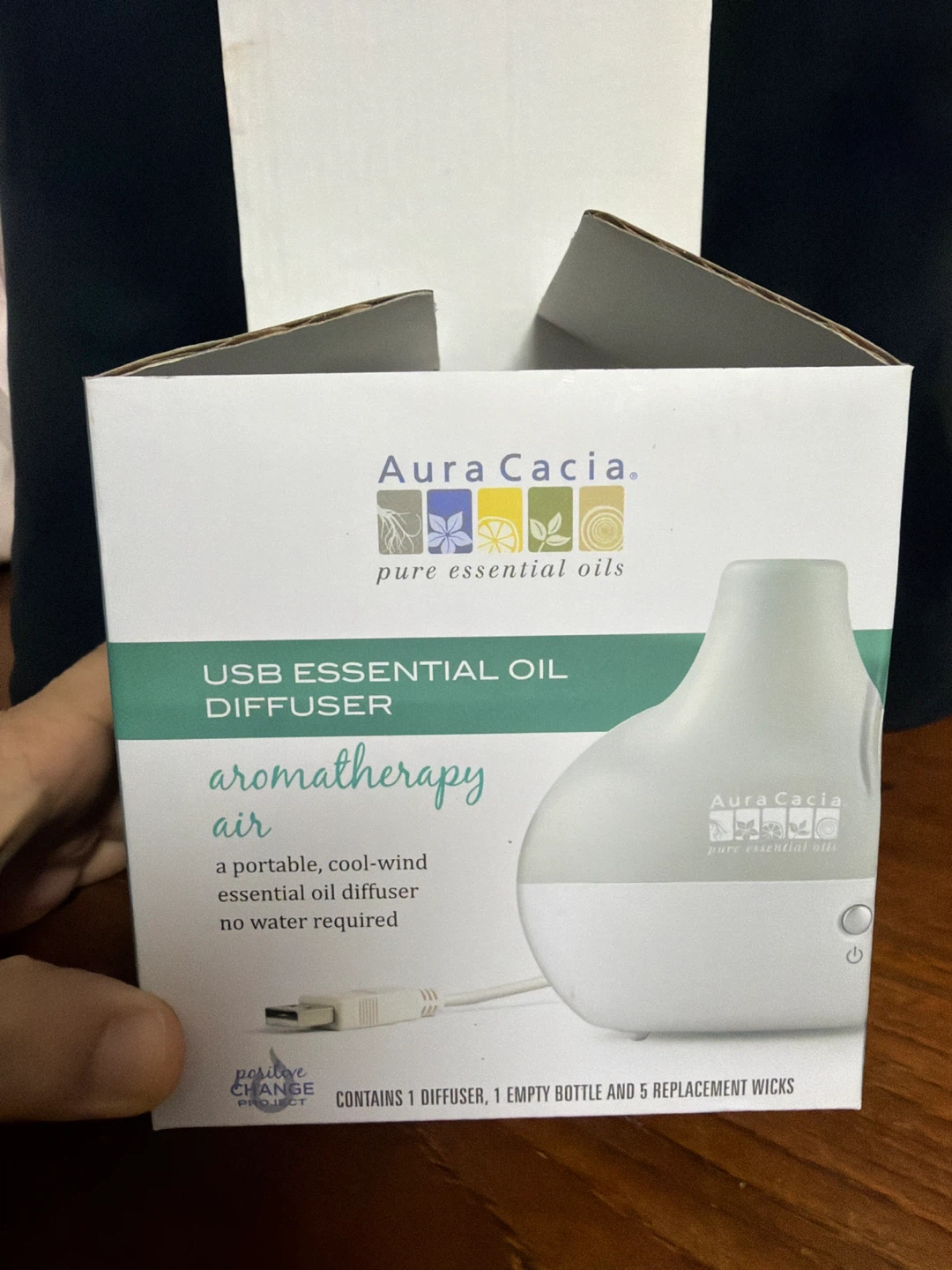This is a portable, cool-wind USB essential oil diffuser. It features a quiet operation and doesn't require water. Includes 1 diffuser, 1 empty bottle, and 5 replacement wicks.