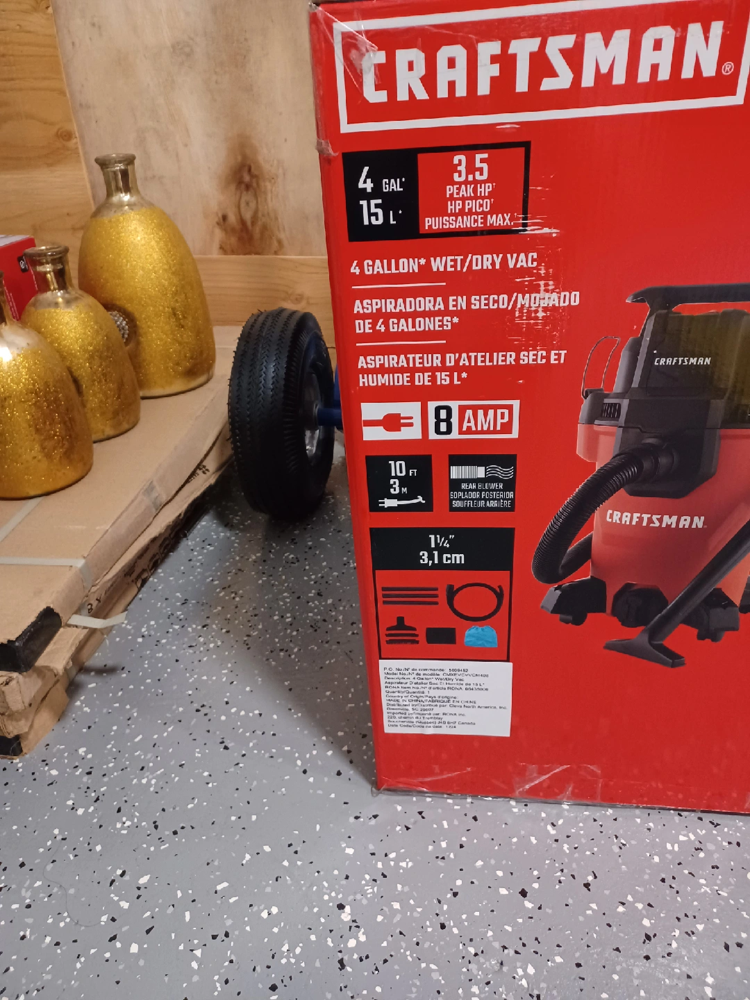 33Selling a brand new Craftsman 4-gallon wet/dry vac, still in its original box! It features a 3.5 peak HP motor and has a capacity of 4 gallons or 15 litres. It also has a balanced top handle for easy transport and 360° swivel casters for mobility. Includes accessory storage and a large, dust-sealed on/off switch. Get your cleaning done with ease!