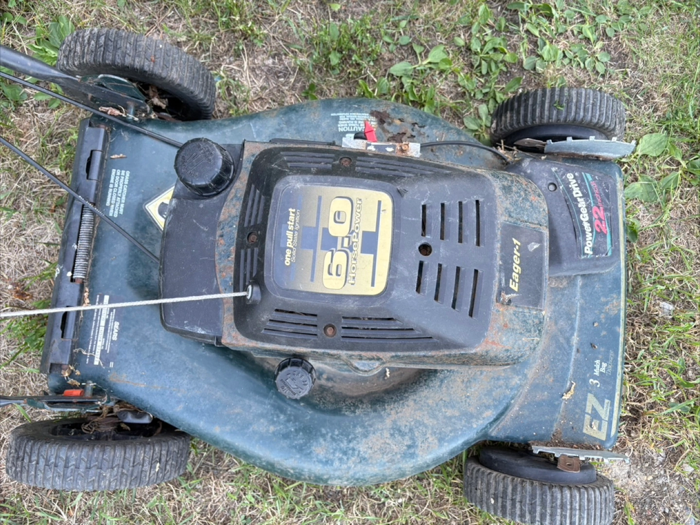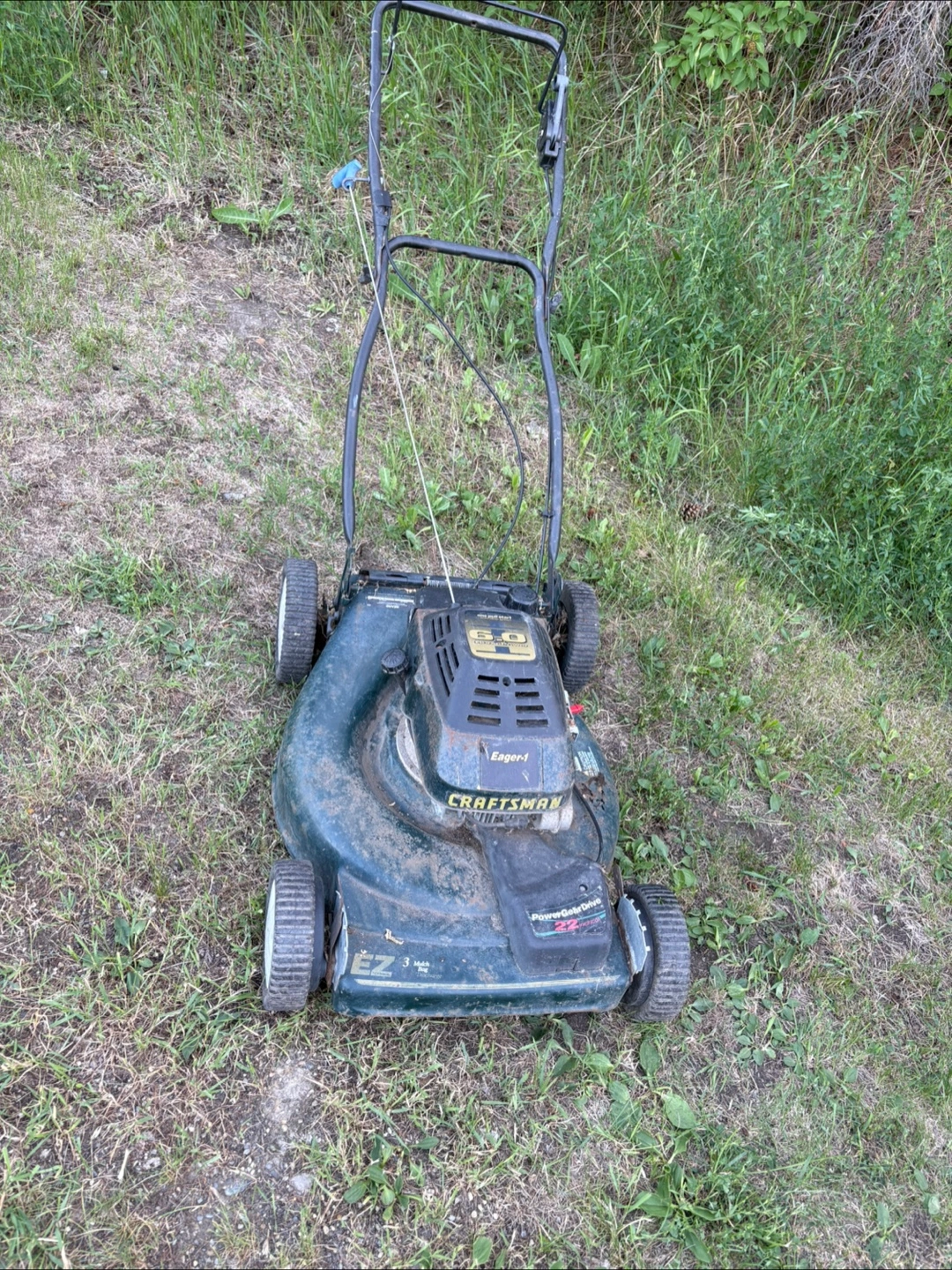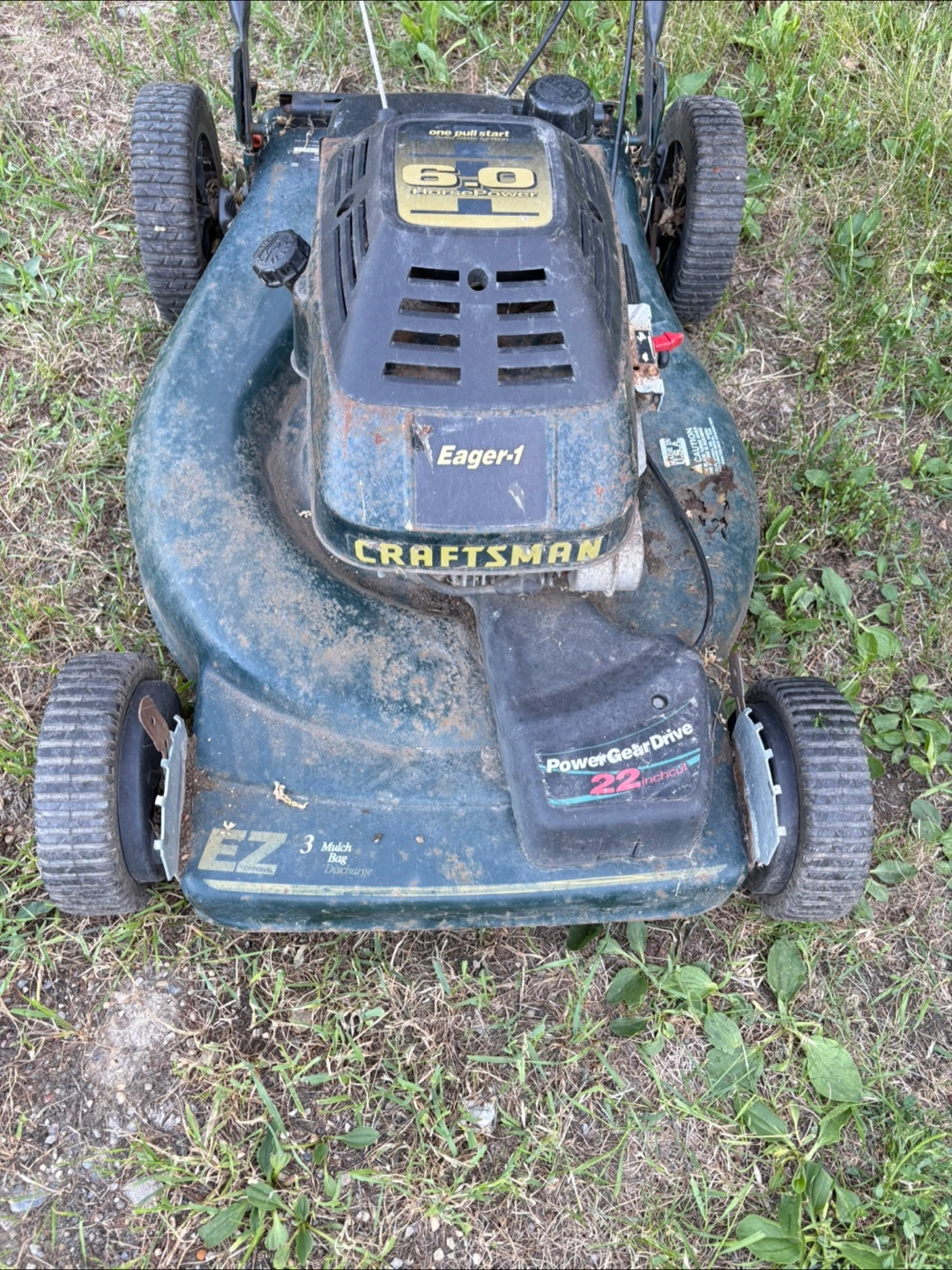48self propelled, power gear drive 6.0 horsepower craftsman 22" cut (eager 1). was at grandpa's cabin at lake and has sat about 2yrs, did work great last time i used it back then, dont know how to go throu it and get it running again $25 as whole/repair if need/ parts thank you π