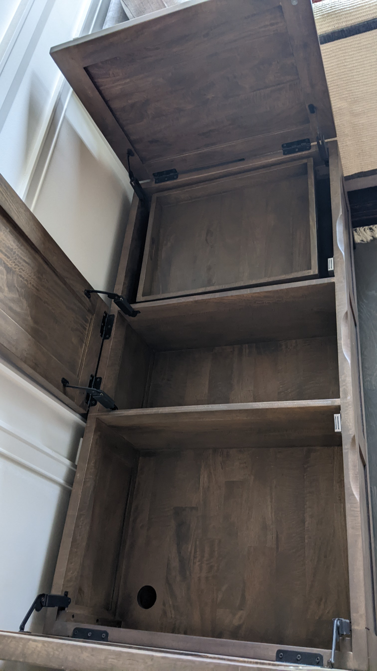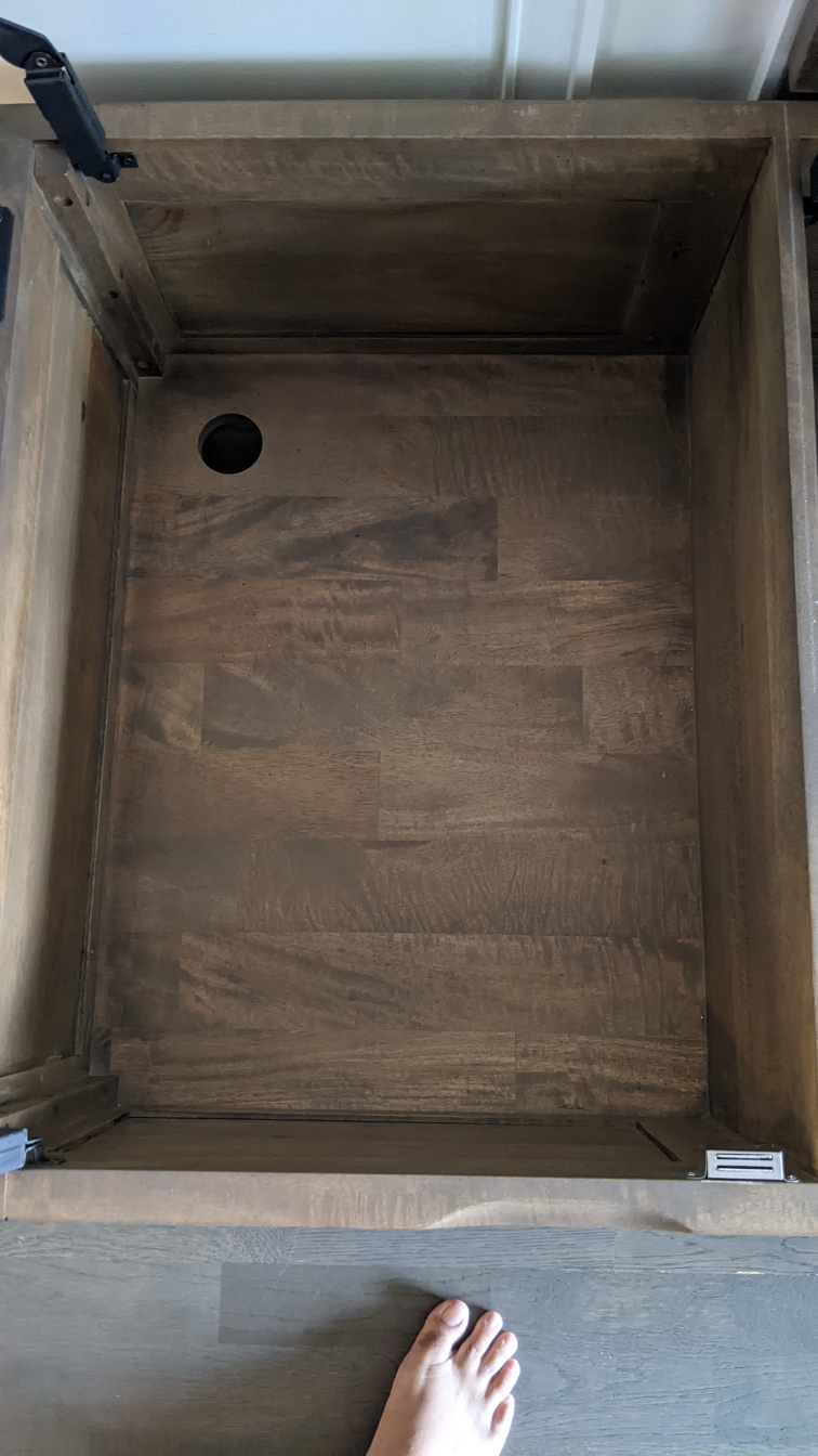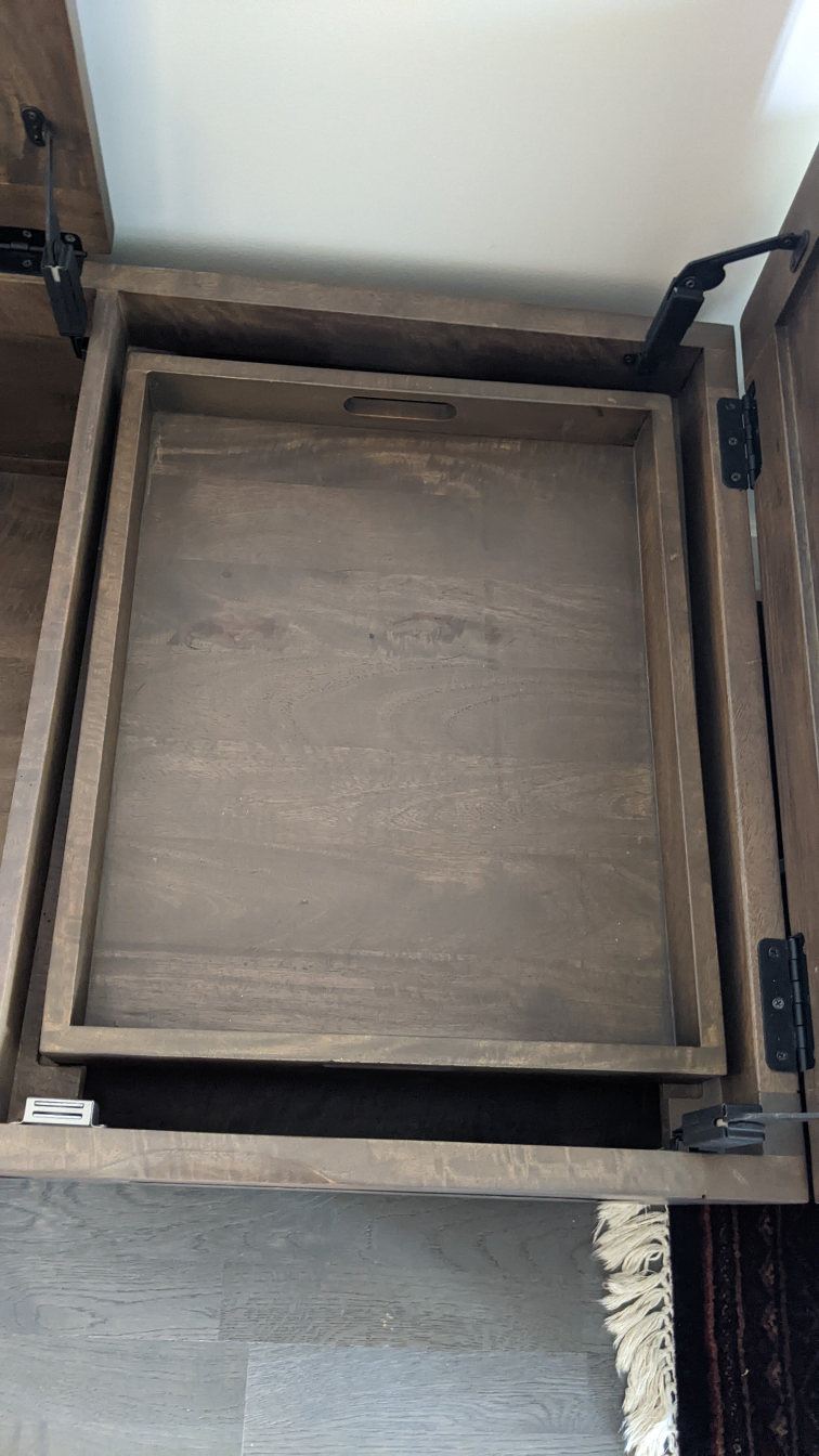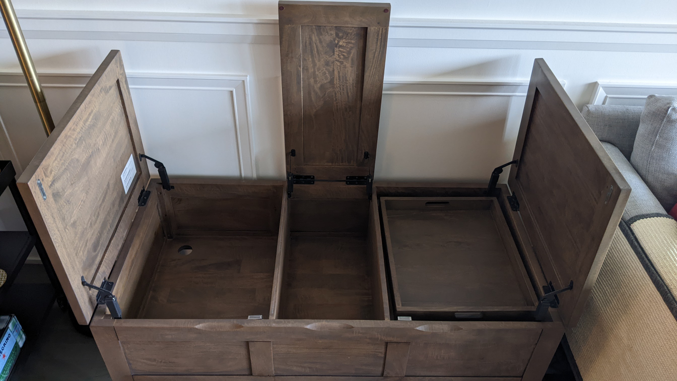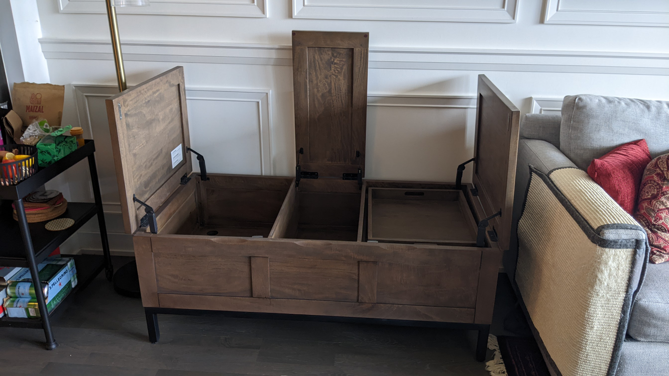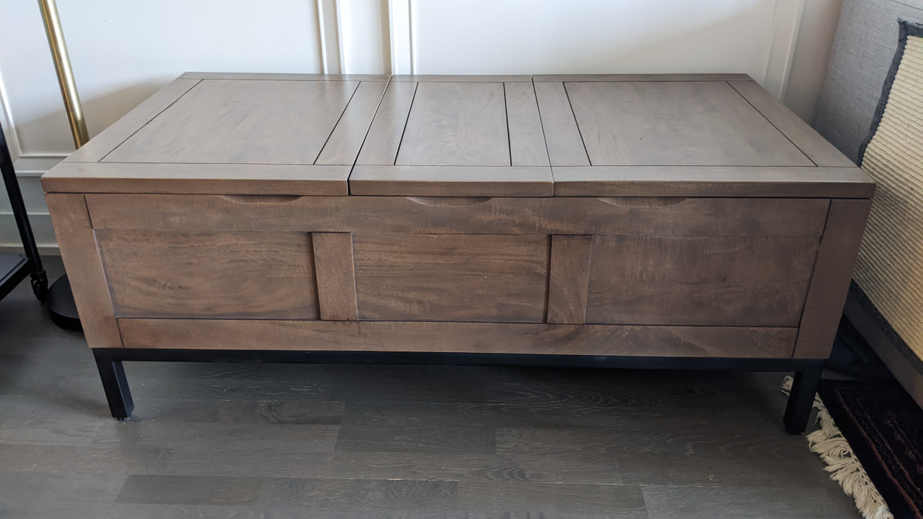 Bought this new from Crate & Barrel in 2020 - it's solid mango wood with an iron base and legs. Tons of space in three storage compartments and also includes a serving tray that sits in the right hand compartment when not in use. Measures 4 ft long by 2 ft deep and 18.5 inches tall, with about 6 inches of clearance off the ground. I've not used it as a coffee table but for storing cushions and games, so it's in excellent condition. Only selling because I need the space!