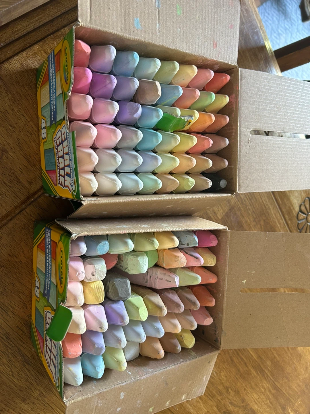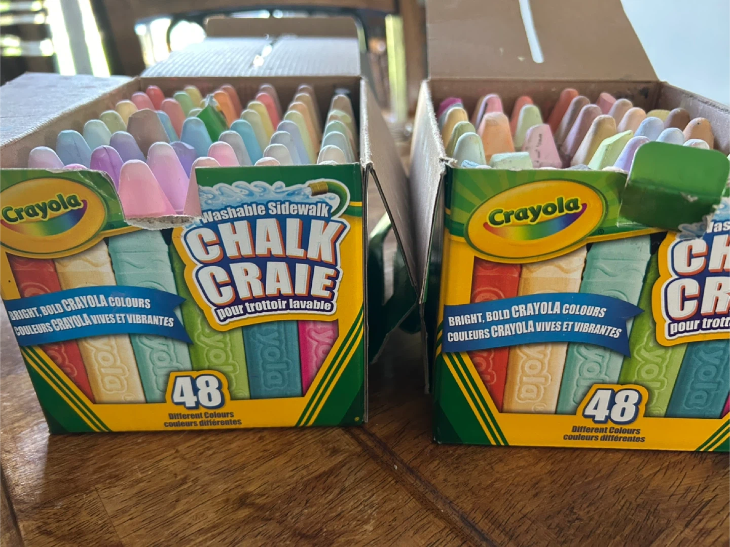111Selling two boxes of Crayola Washable Sidewalk Chalk! Each box contains 48 different colours. Perfect for some outdoor fun and creating colourful sidewalk art! Slightly used 8.00 for both sold together