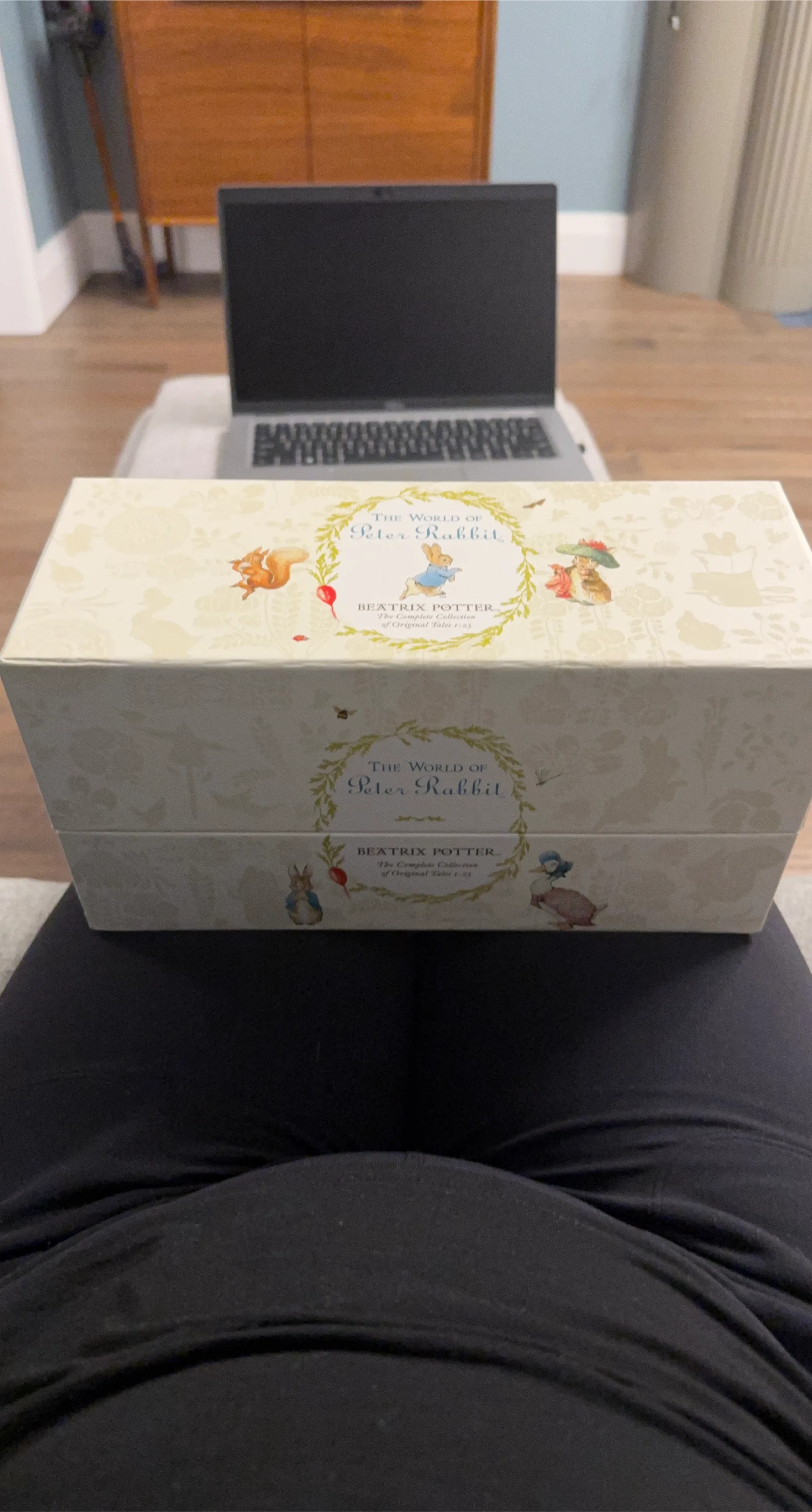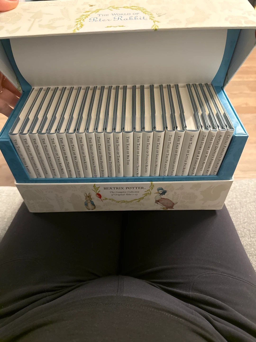 This collection features 'The World of Peter Rabbit' by Beatrix Potter. It includes a set of small books with titles like 'The Tale of Peter Rabbit' and 'The Tale of Jemima Puddle-Duck'. The books are housed in a decorative box.