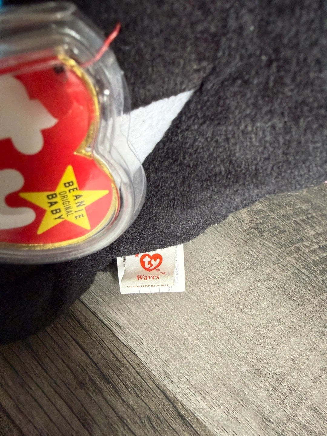 This is a Ty Beanie Baby plush of a killer whale named Waves. It's made of soft, plush material. This collectible toy is perfect for any Beanie Baby enthusiast!