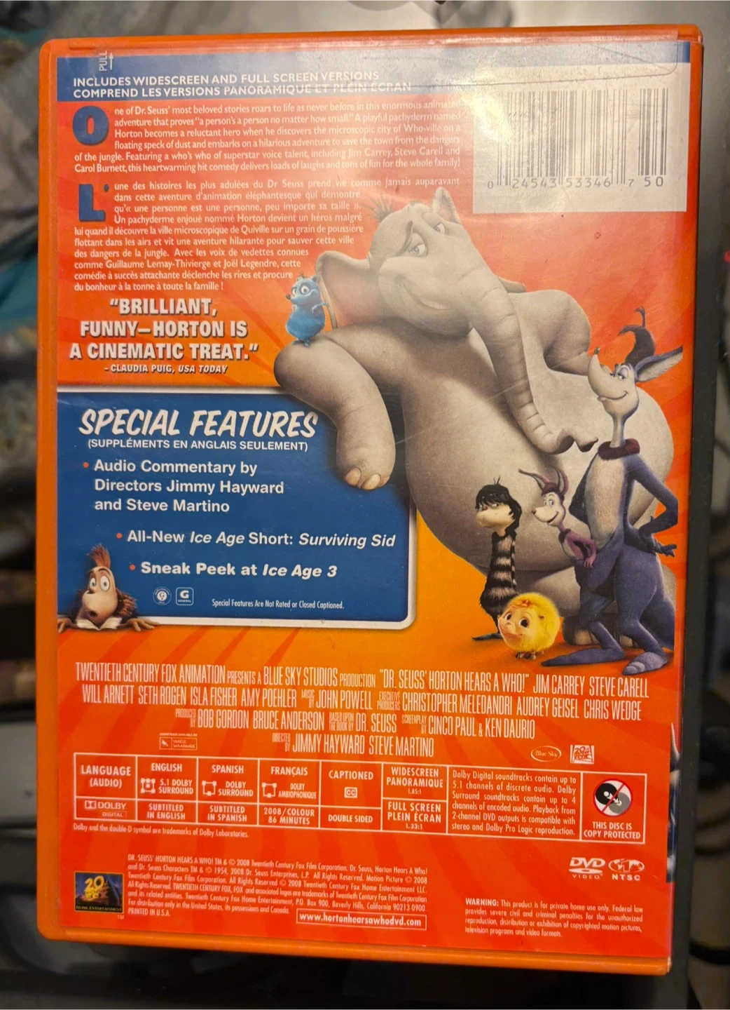 This is the Dr. Seuss' Horton Hears a Who! DVD. It includes audio commentary by Jimmy Haywood and Steve Martino. Also features a "All New Ice Age Short: Surviving Sid".